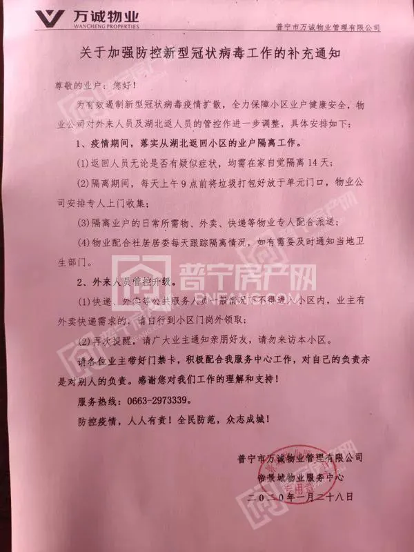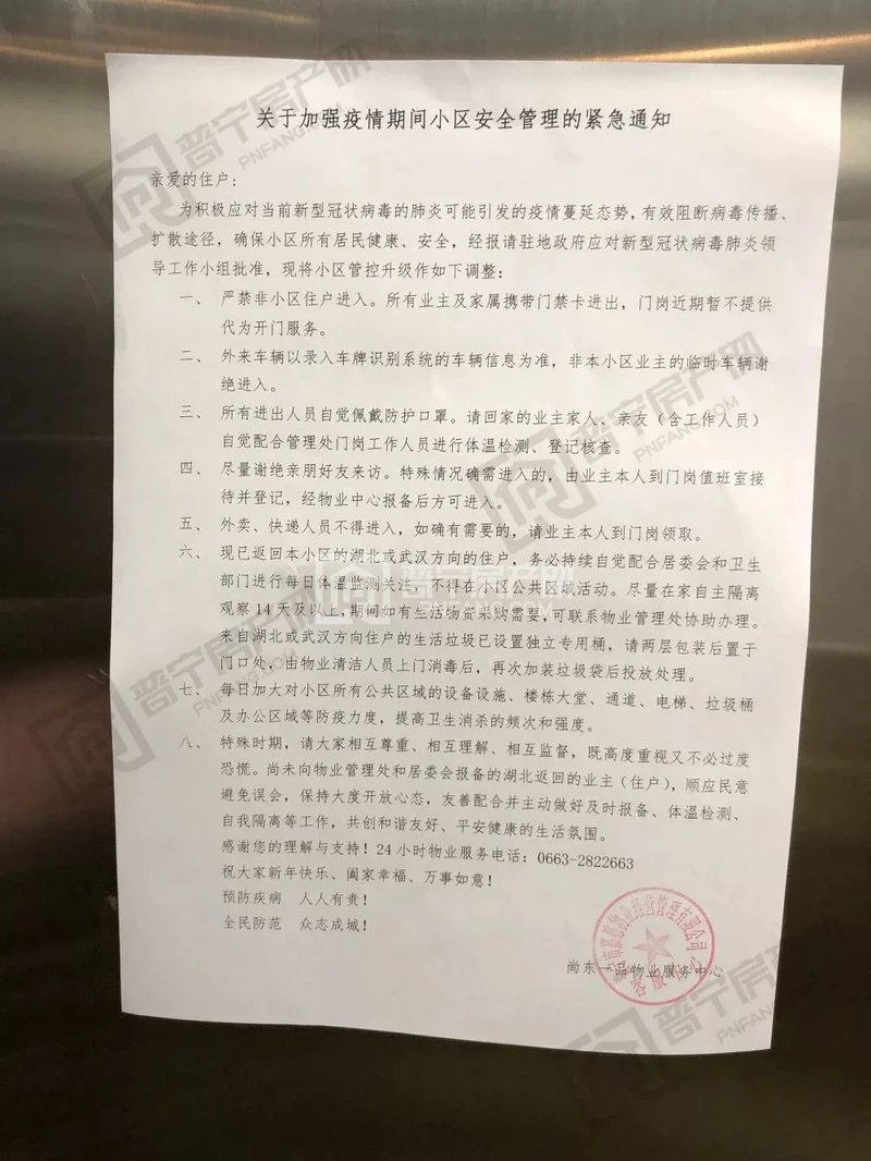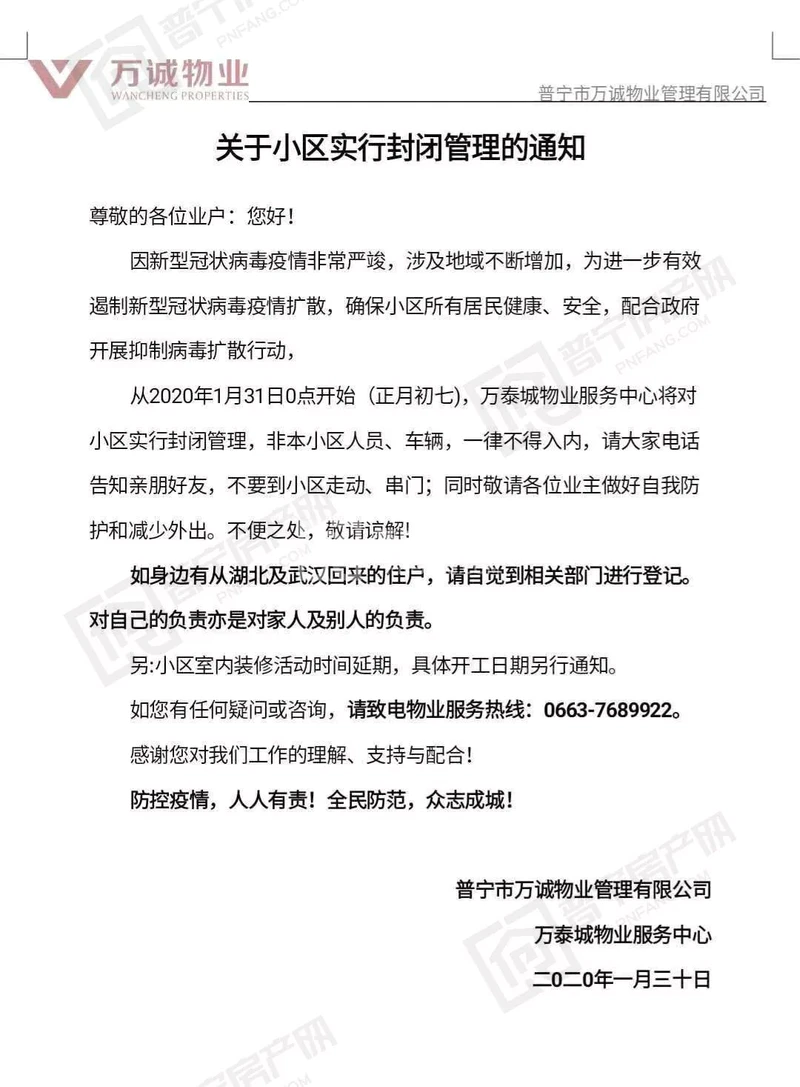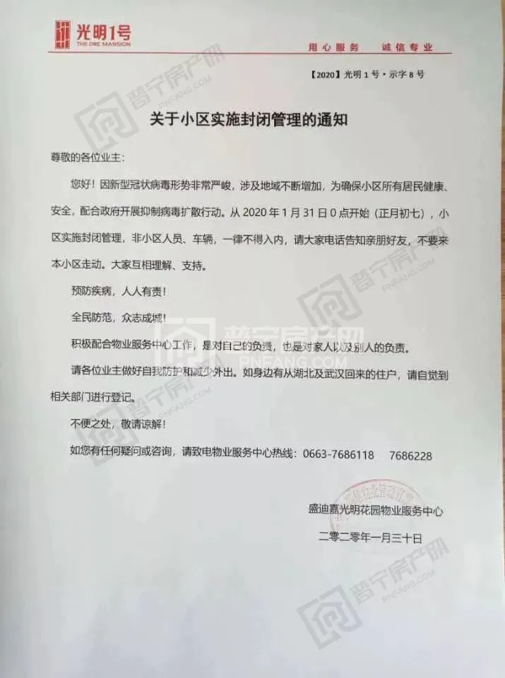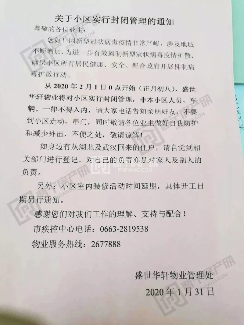 小区封闭管理在保护别人的同时也保护了我们自己,也希望业主能自觉做好个人卫生防护,尽量做到不串门拜年、聚会,阻断病毒传播途径。