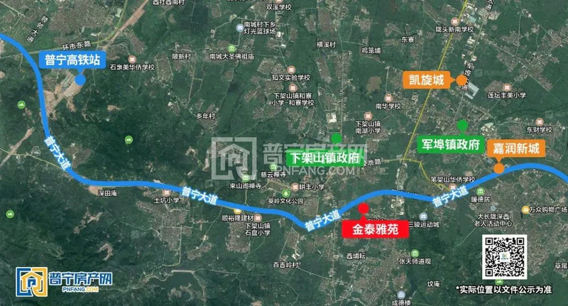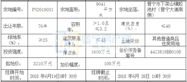该地块位于普宁市下架山镇蛟池村,出让年限70年,容积率3.2,建筑限高45米,占地面积9041平方米,约13.6亩,将建设普通商品住房。如今,下架山镇将迎来首个70年国有产权楼盘,且项目毗邻凯旋城(楼盘详情户型图相册地图0663-2559559)和嘉润新城(楼盘详情户型图相册地图0663-2559559)。未来会如何规划?敬请留意普宁房产网后续报道!