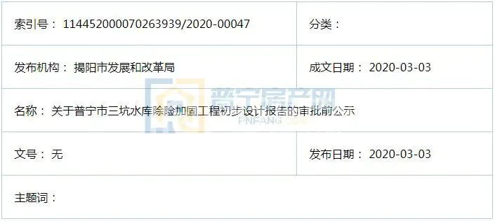 近日,揭阳市发展和改革局发布了《 关于普宁市三坑水库除险加固工程初步设计报告的审批前公示》。
