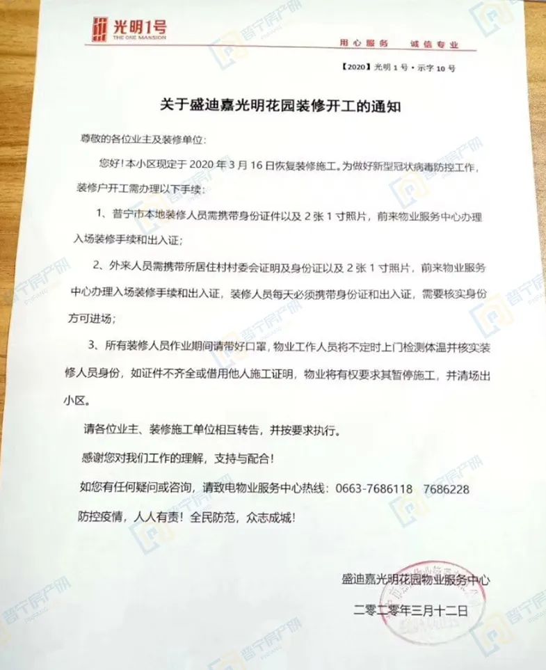 因防控新型冠状病毒,目前要开工装修的需要办理以下手续:2、外来人员需携带居住村村委会证明、泗竹埔(楼盘详情户型图相册地图)村委会证明、身份证、前来物业办理入场装修手续和(施工证)工作人员每天必须携带身份证(施工证),需要核实身份才可进场装修。3、所有施工人员作业期间请带好口罩,物业工作人员会不定时上门检查体温并核实施工人员身份,如证件不齐全或借用施工证明,物业方有权叫停施工。据小房君了解,光明1号定于2020年3月16日恢复装修施工。为做好新型冠状病毒防控工作,装修户开工需办理以下手续: