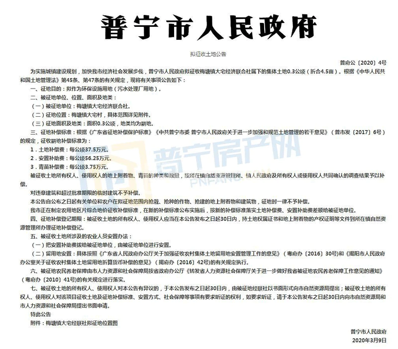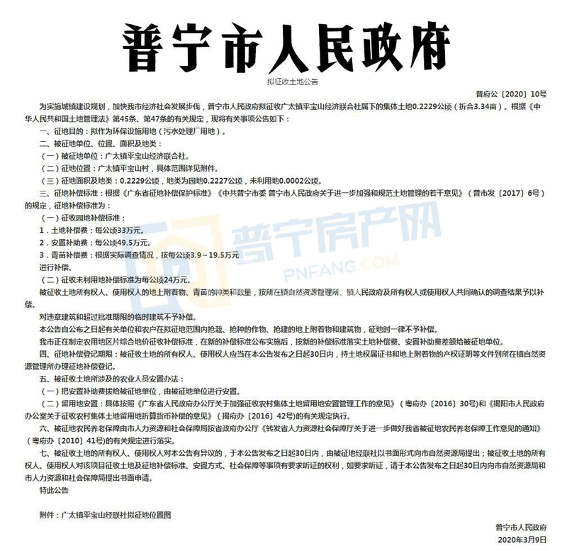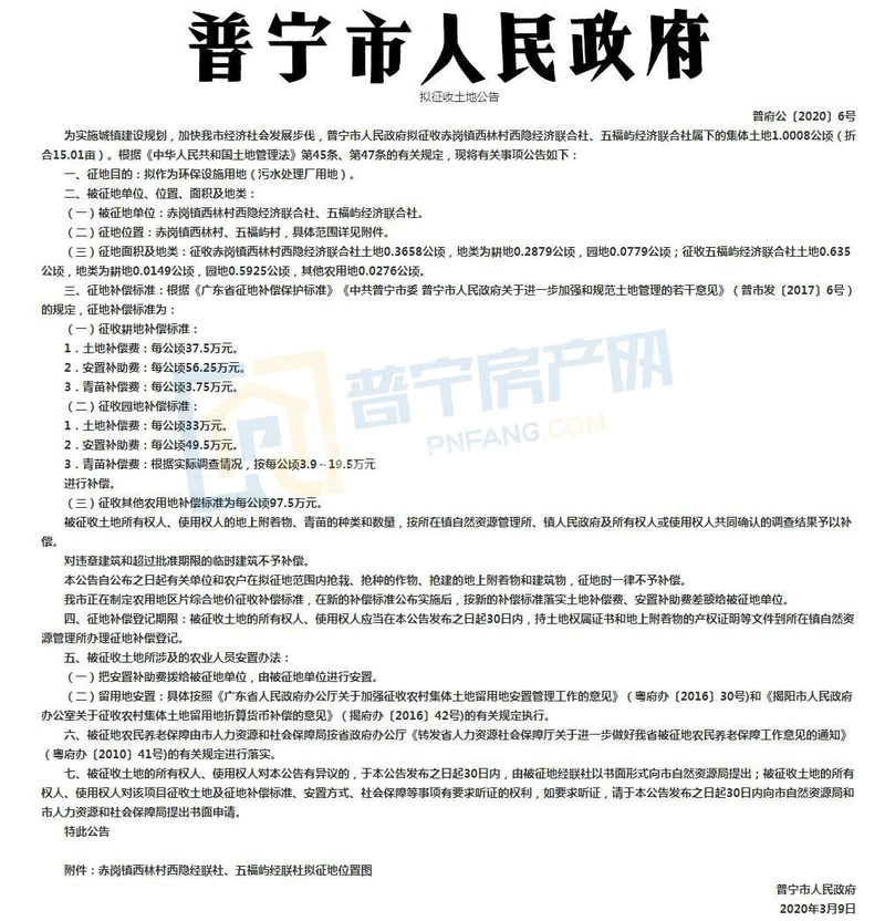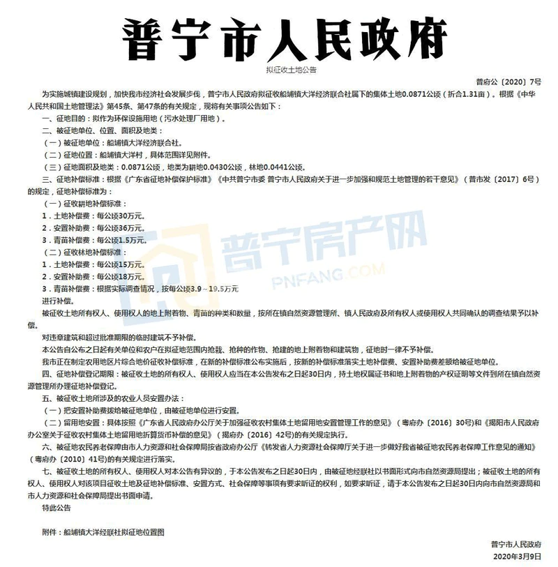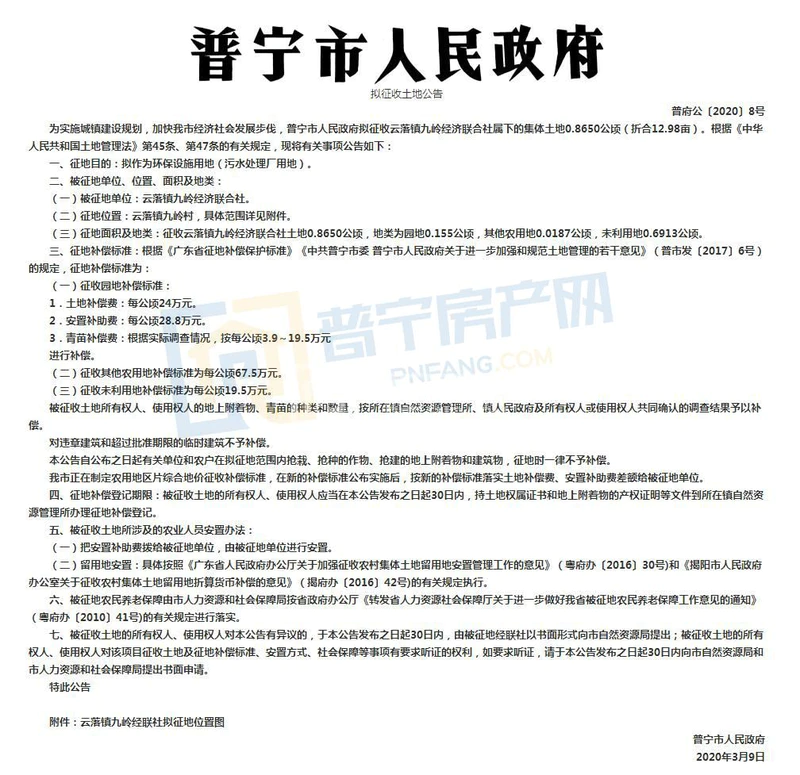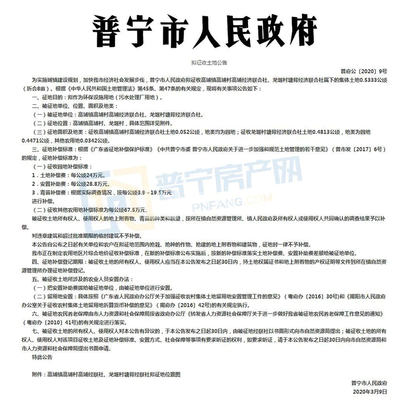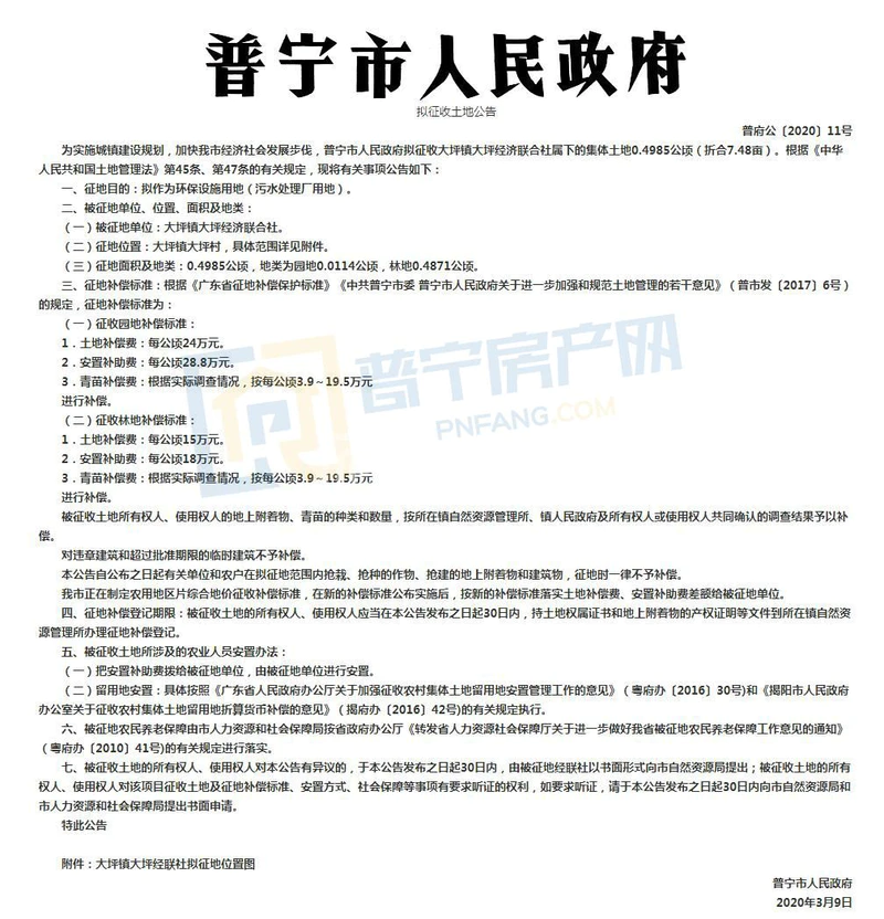一、大坪镇大坪村 一、征地目的:拟作为环保设施用地(污水处理厂用地)。 二、被征地单位、位置、面积及地类: (一)被征地单位:大坪镇大坪经济联合社。 (二)征地位置:大坪镇大坪村,具体范围详见附件。 (三)征地面积及地类:0.4985公顷,地类为园地0.0114公顷,林地0.4871公顷。 三、征地补偿标准:根据《广东省征地补偿保护标准》《中共普宁市委 普宁市人民政府关于进一步加强和规范土地管理的若干意见》(普市发〔2017〕6号)的规定,征地补偿标准为: (一)征收园地补偿标准: 1.土地补偿费:每公顷24万元。 2.安置补助费:每公顷28.8万元。 3.青苗补偿费:根据实际调查情况,按每公顷3.9~19.5万元进行补偿。 (二)征收林地补偿标准: 1.土地补偿费:每公顷15万元。 2.安置补助费:每公顷18万元。 3.青苗补偿费:根据实际调查情况,按每公顷3.9~19.5万元进行补偿。 二、广太镇平宝山村 一、征地目的:拟作为环保设施用地(污水处理厂用地)。 二、被征地单位、位置、面积及地类: (一)被征地单位:广太镇平宝山经济联合社。 (二)征地位置:广太镇平宝山村,具体范围详见附件。 (三)征地面积及地类:0.2229公顷,地类为园地0.2227公顷,未利用地0.0002公顷。 三、征地补偿标准:根据《广东省征地补偿保护标准》《中共普宁市委 普宁市人民政府关于进一步加强和规范土地管理的若干意见》(普市发〔2017〕6号)的规定,征地补偿标准为: (一)征收园地补偿标准: 1.土地补偿费:每公顷33万元。 2.安置补助费:每公顷49.5万元。 3.青苗补偿费:根据实际调查情况,按每公顷3.9~19.5万元进行补偿。 (二)征收未利用地补偿标准为每公顷24万元。 三、高埔镇高埔村、龙堀村 一、征地目的:拟作为环保设施用地(污水处理厂用地)。 二、被征地单位、位置、面积及地类: (一)被征地单位:高埔镇高埔村高埔经济联合社、龙堀村塘背经济联合社。 (二)征地位置:高埔镇高埔村、龙堀村,具体范围详见附件。 (三)征地面积及地类:征收高埔镇高埔村高埔经济联合社土地0.052公顷,地类均为园地;征收龙堀村塘背经济联合社土地0.4813公顷,地类为园地0.4471公顷,其他农用地0.0342公顷。 三、征地补偿标准:根据《广东省征地补偿保护标准》《中共普宁市委 普宁市人民政府关于进一步加强和规范土地管理的若干意见》(普市发〔2017〕6号)的规定,征地补偿标准为: (一)征收园地补偿标准: 1.土地补偿费:每公顷24万元。 2.安置补助费:每公顷28.8万元。 3.青苗补偿费:根据实际调查情况,按每公顷3.9~19.5万元进行补偿。 (二)征收其他农用地补偿标准为每公顷67.5万元。 四、云落镇九岭村 一、征地目的:拟作为环保设施用地(污水处理厂用地)。 二、被征地单位、位置、面积及地类: (一)被征地单位:云落镇九岭经济联合社。 (二)征地位置:云落镇九岭村,具体范围详见附件。 (三)征地面积及地类:征收云落镇九岭经济联合社土地0.8650公顷,地类为园地0.155公顷,其他农用地0.0187公顷,未利用地0.6913公顷。 三、征地补偿标准:根据《广东省征地补偿保护标准》《中共普宁市委 普宁市人民政府关于进一步加强和规范土地管理的若干意见》(普市发〔2017〕6号)的规定,征地补偿标准为: (一)征收园地补偿标准: 1.土地补偿费:每公顷24万元。 2.安置补助费:每公顷28.8万元。 3.青苗补偿费:根据实际调查情况,按每公顷3.9~19.5万元进行补偿。 (二)征收其他农用地补偿标准为每公顷67.5万元。 (三)征收未利用地补偿标准为每公顷19.5万元。 五、船埔镇大洋村 一、征地目的:拟作为环保设施用地(污水处理厂用地)。 二、被征地单位、位置、面积及地类: (一)被征地单位:船埔镇大洋经济联合社。 (二)征地位置:船埔镇大洋村,具体范围详见附件。 (三)征地面积及地类:0.0871公顷,地类为耕地0.0430公顷,林地0.0441公顷。 三、征地补偿标准:根据《广东省征地补偿保护标准》《中共普宁市委 普宁市人民政府关于进一步加强和规范土地管理的若干意见》(普市发〔2017〕6号)的规定,征地补偿标准为: (一)征收耕地补偿标准: 1.土地补偿费:每公顷30万元。 2.安置补助费:每公顷36万元。 3.青苗补偿费:每公顷1.5万元。 (二)征收林地补偿标准: 1.土地补偿费:每公顷15万元。 2.安置补助费:每公顷18万元。 3.青苗补偿费:根据实际调查情况,按每公顷3.9~19.5万元进行补偿。 六、赤岗镇西林村、五福屿村 一、征地目的:拟作为环保设施用地(污水处理厂用地)。 二、被征地单位、位置、面积及地类: (一)被征地单位:赤岗镇西林村西隐经济联合社、五福屿经济联合社。 (二)征地位置:赤岗镇西林村、五福屿村,具体范围详见附件。 (三)征地面积及地类:征收赤岗镇西林村西隐经济联合社土地0.3658公顷,地类为耕地0.2879公顷,园地0.0779公顷;征收五福屿经济联合社土地0.635公顷,地类为耕地0.0149公顷,园地0.5925公顷,其他农用地0.0276公顷。 三、征地补偿标准:根据《广东省征地补偿保护标准》《中共普宁市委 普宁市人民政府关于进一步加强和规范土地管理的若干意见》(普市发〔2017〕6号)的规定,征地补偿标准为: (一)征收耕地补偿标准: 1.土地补偿费:每公顷37.5万元。 2.安置补助费:每公顷56.25万元。 3.青苗补偿费:每公顷3.75万元。 (二)征收园地补偿标准: 1.土地补偿费:每公顷33万元。 2.安置补助费:每公顷49.5万元。 3.青苗补偿费:根据实际调查情况,按每公顷3.9~19.5万元进行补偿。 (三)征收其他