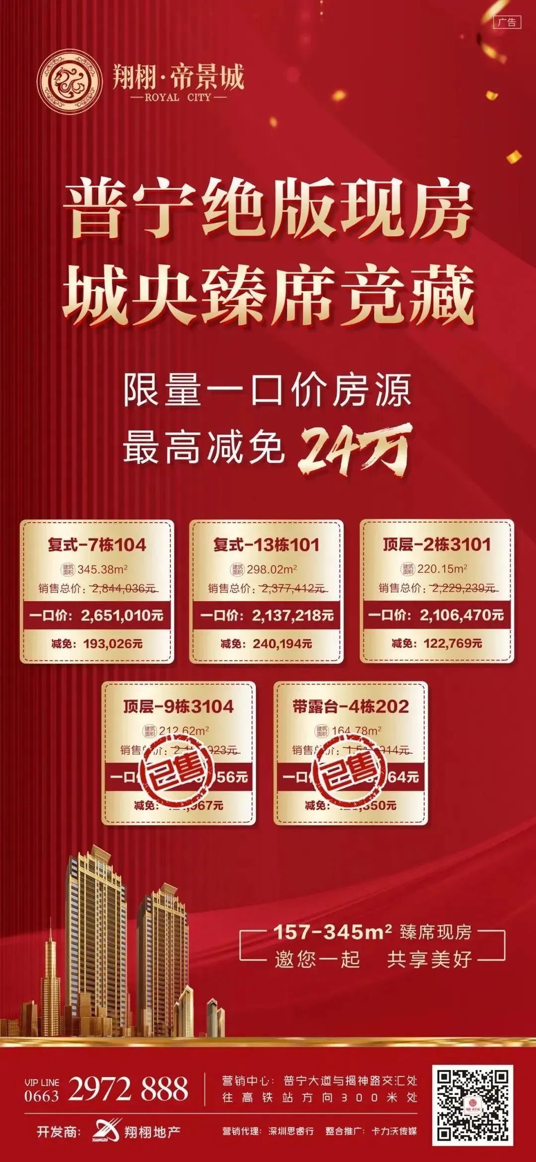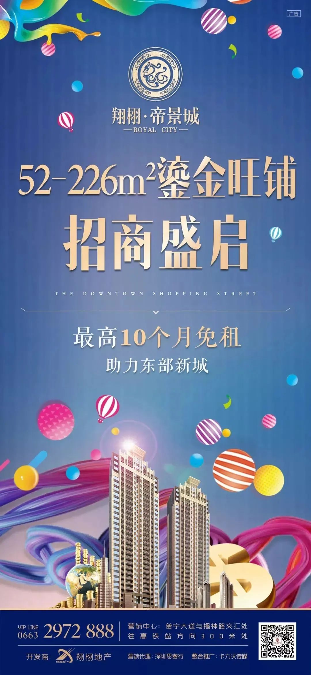 在万商齐聚的经济浪潮里 每位理性经济人都为自己的财富精打细算 “理财无数,不如一间旺铺” 面对多变的经济形势 商铺依然是不少投资者的心头好 热势持续升温 俗话说,一铺养三代 经营商铺所能带来的经济收益不言而喻 那么,在普宁什么样的商铺值得入手呢? 翔栩·帝景城 52-226㎡鎏金旺铺 3月25日 招商盛启 普宁东部新城+高铁核心区 根据政府城市规划设计 东部新城起步区 将成为集多面于一体的城市副中心 而近在咫尺的普宁高铁站 更是将帝景城商铺划入高铁核心辐射圈 将区域经济带入高铁时代 交通路网环伺 四通八达 普宁大道、北二环、揭神路等交通干线环伺 为帝景城商铺形成四通八达格局 绝佳地理位置 汇融多元业态 聚焦人气 成行成市 优势地段 吸引消费人潮 带来律动城市生活圈 毗邻千亿产业园区 优质社区助力 毗邻康美中药城 依靠帝景城优质社区 汇聚高端客户 周边更有水岸城、盈泰华府(楼盘详情户型图相册地图0663-2559559)等大型项目 抢占先机 即可坐拥繁华 百变空间 万千业态任选 单间商铺52-226㎡ 大小面积 各取所需 7.2米超大层高 一层商铺 享两层空间 养生保健、建材装饰、宠物超市 花饰花艺、药店、房产中介...... 满足多样经营需求 与其向往,不如拥有 3月25日 租金最低仅需39元/㎡ 3年起租 最高10个月免租 财富触手可及 资产绝佳配置 普宁绝版现房 礼献品质生活 同步热销中 限量热销 即买即交楼 美好生活触手可及 --帝景专线-- 0663-2972888 --营销中心-- 普宁大道与揭神路交汇处往高铁站方向300米处