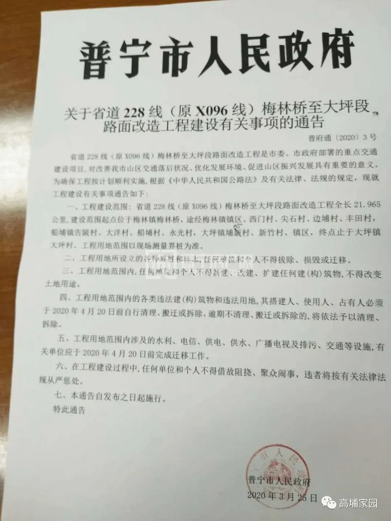 关于省道228线(原X096线)梅林桥至大坪段路面改造工程建设有关事项的通告 普府通(2020)3号 省道228线(原X096线)梅林桥至大坪段路面改造工程是市委、市政府部署的重点交通建设项目,对改善我市山区交通落后状况、优化发展环境、促进山区振兴发展具有重要的意义。为确保工程按计划顺利实施,根据《中华人民共和国公路法》及有关法律、法规的规定,现就工程建设有关事项通告如下: 一、工程建设范围:省道228线(原X096线)梅林桥至大坪段路面改造工程全长21. 965公里,建设范围起点位于梅林镇梅林桥,途经梅林镇镇区、西门村、尖石村、边埔村、丰田村,船埔镇告陂村、大洋村、船埔村、永光村,大坪镇埔心村、新竹村、镇区,终点止于大坪镇大坪村。工程用地范围以现场测量界桩为准。 二、工程用地所设立的各种界桩和标志,任何单位和个人不得拔除、损毁或迁移。 三、工程用地范围内,任何单位和个人不得新建、改建、扩建任何建(构)筑物,不得改变土地用途。 四、工程用地范围内的各类违法建(构)筑物和违法用地,其搭建人、使用人、占有人必须于2020年4月20日前自行清理、搬迁或拆除,逾期不清理、搬迁或拆除的,将依法予以清理、拆除。 五、工程用地范围内涉及的水利、电信、 供电、供水、广播电视及排污、交通等设施,有关单位应于2020年4月20日前完成迁移工作。 六、在工程建设过程中,任何单位和个人不得借故阻挠、聚众闹事,违者将按有关法律法规从严惩处。 七、本通告自发布之日起施行。 特此通告 普宁市人民政府 2020年3月25日