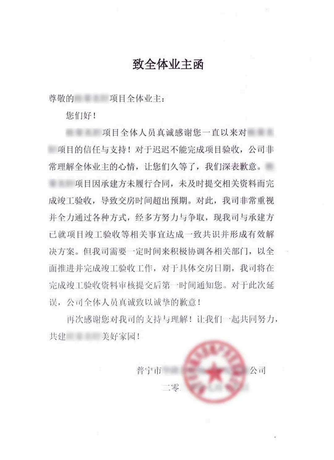 本项目全体人员真诚感谢您一直以来对项目的信任与支持!对于迟迟不能完成项目验收,公司非常理解全体业主的心情,让您们久等了,我们深表歉意。本项目因承建方未履行合同,未及时提交相关资料而完成竣工验收,导致交房时间超出预期。对此,我司非常重视并全力通过各种方式,经多方努力与争取,现我司与承建方已就项目竣工验收等相关事宜达成一致共识并形成有效解决方案。但我司需要一定时间来积极协调各相关部门,以全面推进并完成竣工验收工作,对于具体交房日期,我司将在完成竣工验收资料审核提交后第一时间通知您。对于此次延误,公司全体人员真诚致以诚挚的歉意!