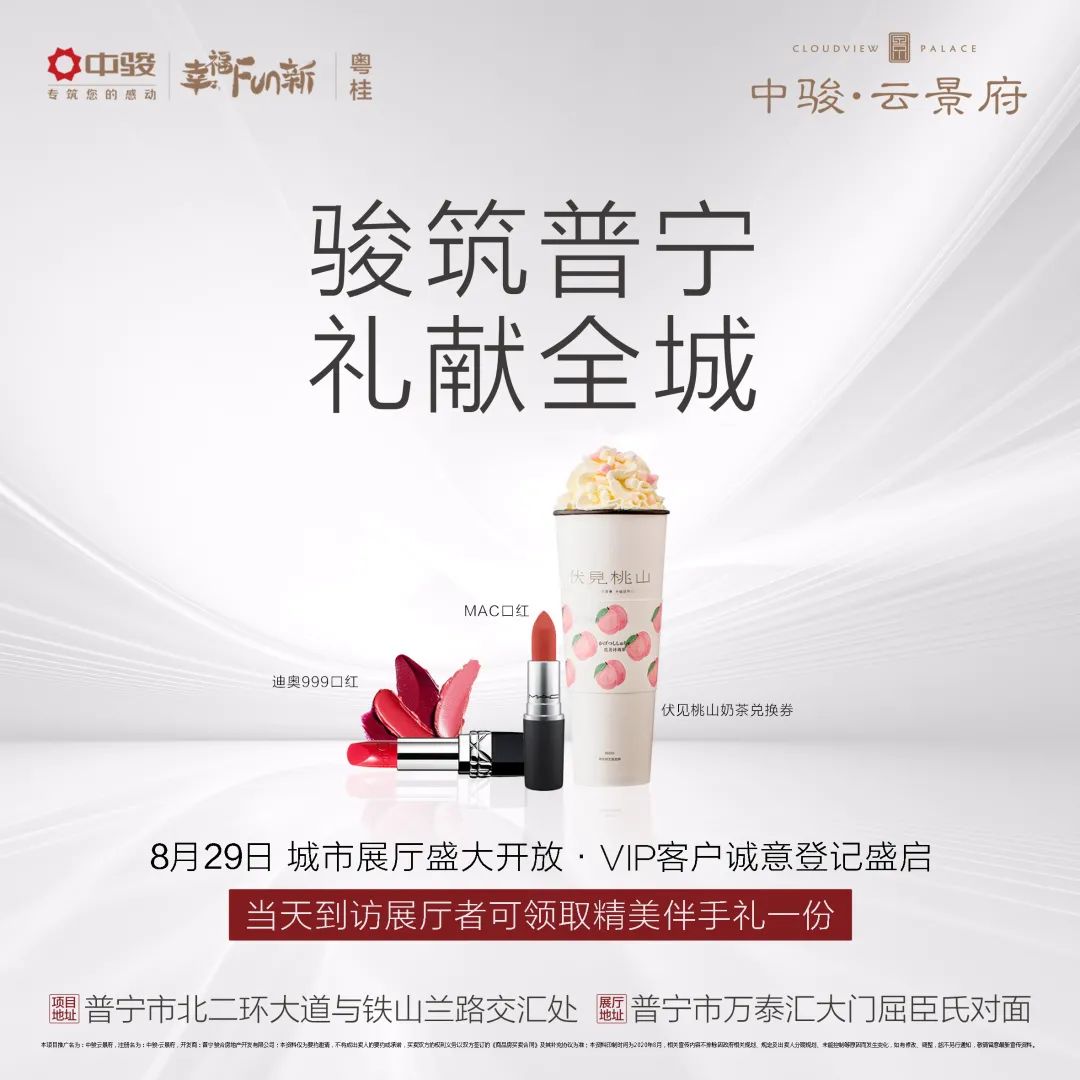中骏集团成立于1987年,总部设立于上海。中骏自成立伊始就开始显现出其包容与张力。以“创建智慧生活,让幸福触手可及”为使命,始终坚持客户至上,立志“打造受人尊敬的百年企业,成为卓越的美好生活引领者”。 (实景图) 33年积累与沉淀,中骏重点布局长三角经济圈、环渤海经济圈、粤港澳大湾区、中部经济区、西部走廊及海峡西岸经济区,现已进入超50多个城市,经过33年的成长,如今已成为全国35强的上市房企,开发的项目涵盖住宅地产、商业地产、文化旅游地产、产业地产等维度;遍布上海、北京、深圳、重庆、天津、杭州、南京、厦门等城市;所开发的产品无一例外地成为了当地的标志性建筑。 (示意图) 幸会普宁 对话未来 “千年商都”,千年以来普宁都是周边的商业都会。这里曾经是中医药文化巅峰与地标。一座拥有悠久历史的古都,承载着深厚的地脉与厚重的文脉。如今,中骏带着“专筑您的感动”的愿景初至普宁,匠心和鸣,将共奏人居新乐章。 (实景图) 33载,中骏集团始终秉持“专注客户需求的匠心精神”,持续为社会创建美好幸福生活!中骏·云景府(楼盘详情户型图相册地图0663-2559559)也将成为升级普宁人居的重要作品。 (实景图) 普宁北拓 争藏领地 随着普宁社会经济的发展,城市已从传统的流沙大道周边,向北外拓,资源倾注的北部,早已成为城市规划的副中心,承接普宁的发展利好,众多品牌开发商也纷纷抢滩普宁北部,蝶变成长,已成为争藏领地。 (实景图) 骏筑云景 人居封面 中骏·云景府位于普宁北部城芯,周边360°配套环伺,拥揽普宁2大城熟商圈(普宁万泰汇商圈、普宁国际商品城商圈),商圈在旁,生活非常便捷,未来价值更加值得期待,附近即享国家级示范学校华美实验学校,约400米就是斗文中学,孩子成长生活无忧无虑。 (效果图) 中骏·云景府更传承中骏“景”字系产品的DNA,以品质、低密度、绿色的现代风格,打造中央花园、阳光跑道。献礼普宁,为普宁打造人居心封面。 (效果图) 首进普宁 礼献全城 抽奖活动参与规则 扫描下方小程序码 ↓ 进入小程序,点击“去参与” 根据提示获取参与资格 ↓ 8月28日18:00 正式开奖 ↓ 中奖用户可凭小程序中奖截图 于8月29日上午11:00到访 中骏云景府城市展厅 (万泰汇大门屈臣氏对面) 兑换相应奖品 未中奖的用户亦可凭参与抽奖截图 至城市展厅兑换精美伴手礼一份 影票数量有限,先到先得 *在法律允许范围内,本活动最终解释权 归普宁中骏云景府开发商所有 活动预告 8月29日 中骏云景府城市展厅盛大开放 三重好礼,致谢普宁 登门礼 凭活动单张上门,兑换精美伴手礼1份 初见礼 到访即可参与现场抽奖活动,华为P40、香奈儿香水、香奈儿口红等好礼送不停 相遇礼 高颜值物业团队巡游,遇上即有礼 展厅地址:普宁市万泰汇大门屈臣氏对面 联系电话:0663-618 0666 8月29日 邀您共鉴 免责声明 2.本规划图所载环境、交通、医疗、商业设施配套与政府规划内容等信息(含图示及文字等)旨在提供相关信息参考,均存在不具体或不确定因素,本规划图所载信息,不在任何意义上作为开发企业的邀约或承诺,买受人应自行查证、了解,不意味着本公司对此做出了承诺; 3.本资料为要约邀请,买卖双方的权利义务以及双方签订的《商品房买卖合同》为准。相关内容如有更新,请以最新资料内容为准,恕不另行通知; 4.活动最终解释权在法律允许范围内归开发商所有。