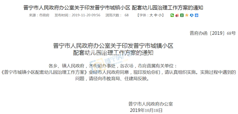 在去年11月,普宁市人民政府办公室印发普宁市城镇小区配套幼儿园治理工作方案的通知中就提到,配套幼儿园应与城镇小区同步进行建设,分期建设的房地产开发项目,城镇小区配套幼儿园应当在首期项目中开发建设并满足使用条件。且小区配套幼儿园应优先满足本小区居民适龄儿童就近入园需要。