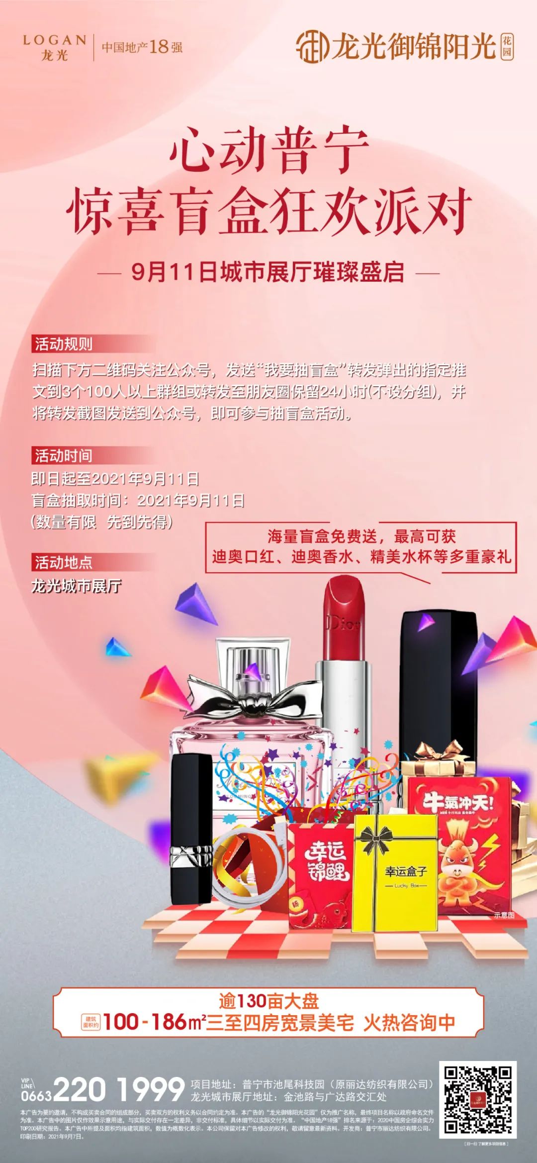 再多华丽的辞藻,抵不过眼见为实的品质与口碑,龙光城市展厅即将开放,以精工品质,著写普宁未来美好生活。不仅如此,现场还有超多精彩活动,邀您一起嗨玩狂欢,来一场盲盒探索的奇妙之旅,未知的礼物带来无限惊喜,最高可获迪奥香水、迪奥口红等多重豪华大礼,心动不如行动,龙光等你来挑战!