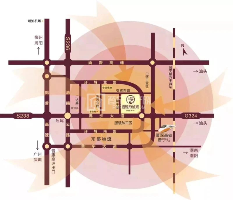 地处普宁市流沙大道与环城北路交汇处,雄踞大粤东枢纽核心、厦深港黄金经济带,无缝接驳广深高铁、潮惠高速、沈海高速,3小时速达珠三角。15分钟直达普宁新客运站、高铁普宁站,1小时直通揭阳潮汕国际机场,便捷融入广深经济圈。