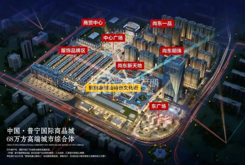 普宁国际商品城占地300多亩,总建筑面积约68万平方米,总投资超12亿,旨在打造普宁地标级城市综合体,集居住、办公、商贸、休闲、购物、餐饮为一体,坐拥商贸中心、美佳乐购物超市、尚东新天地(楼盘详情户型图相册地图0663-2559559)大型商业综合体、尚东一品(楼盘详情户型图相册地图0663-2559559)高端住宅小区,附带两大休闲广场,是当前普宁规模最大、配套最全的多功能综合体,具有不可复制的唯一性,未来可期。