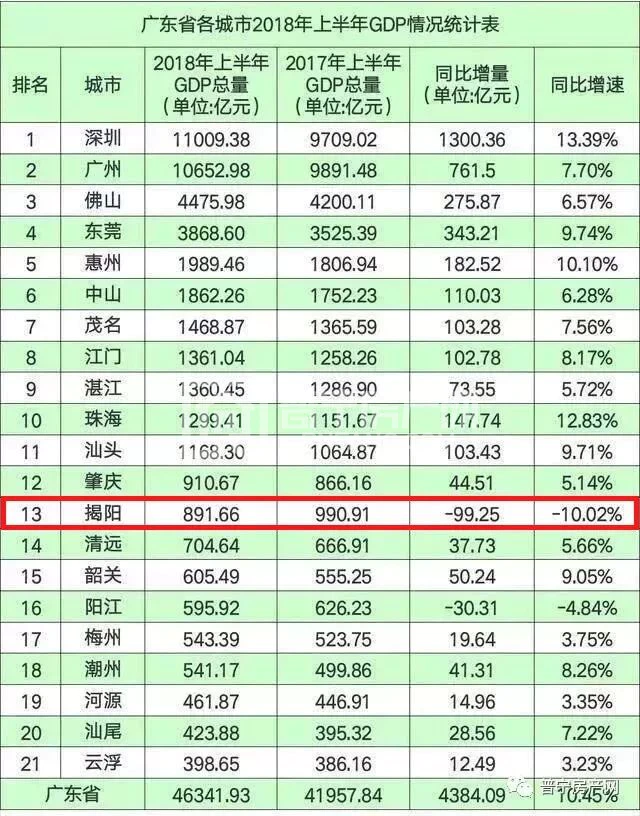 在《广东省各城市2018年上半年GDP统计表》中,揭阳GDP也出现了负增长。揭阳,2018年上半年GDP为891.66亿元,经济增速为负10.02%,成为省内倒退最快的城市,为我们敲响了警钟!不能走靠房地产拉动GDP的老路!