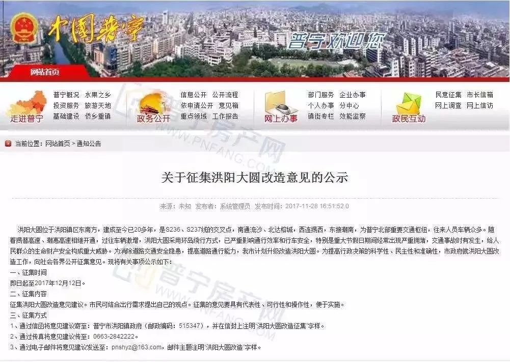 2017年12月关于普宁市政府发布征集洪阳大圆改造意见的公示,向社会各界公开征集意见。