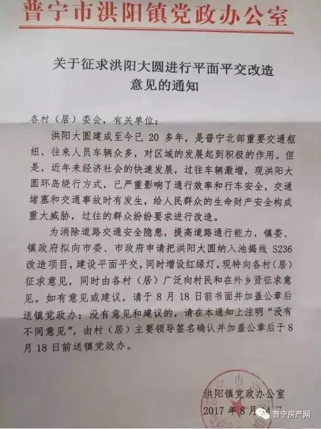 2017年8月为消除道路交通安全隐患,镇委、镇政府拟向市委、市政府申请,把洪阳大圆纳入池揭线S236改造项目建设平面平交,同时增设红绿灯,向各村居征求意见,同时由各村(居)广泛向村民和外乡贤征求意见。