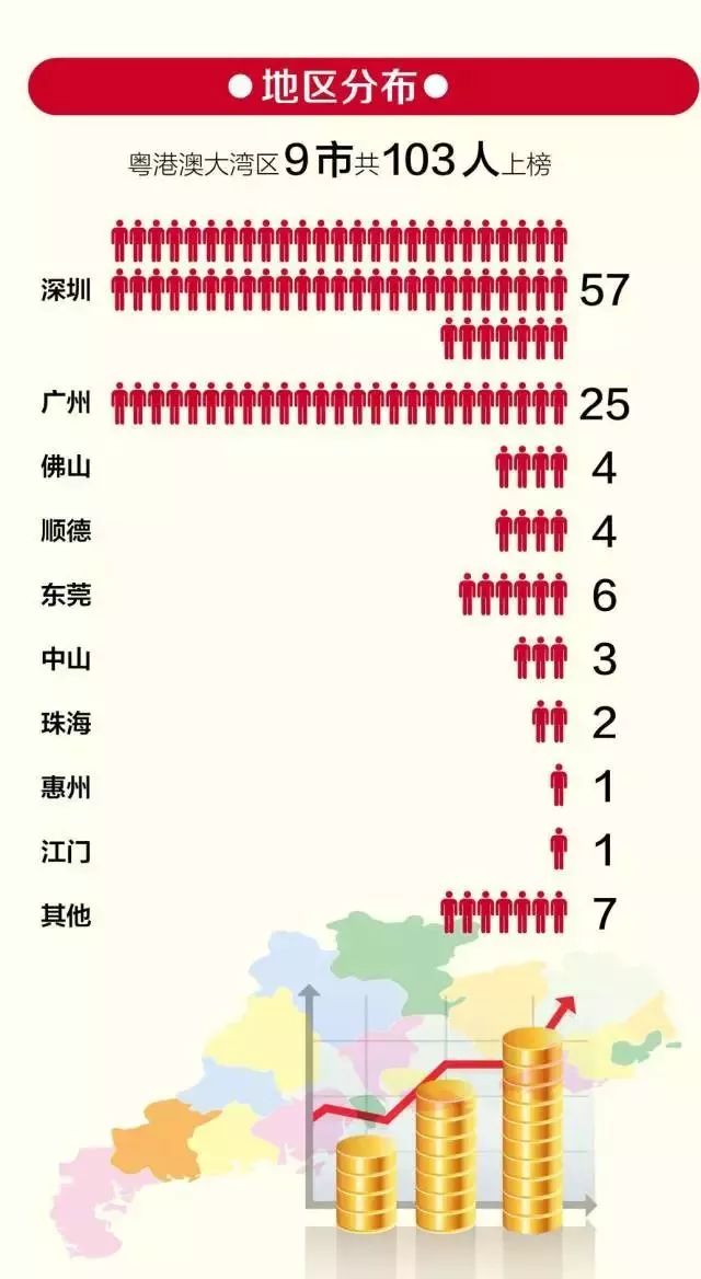 粤港澳大湾区9市共 103人上榜,其中深圳贡献了57人,遥遥领先;广州次之,共25人上榜;佛山8人,其中4人来自顺德;东莞6人,中山3人,珠海2人;惠州和江门各1人。