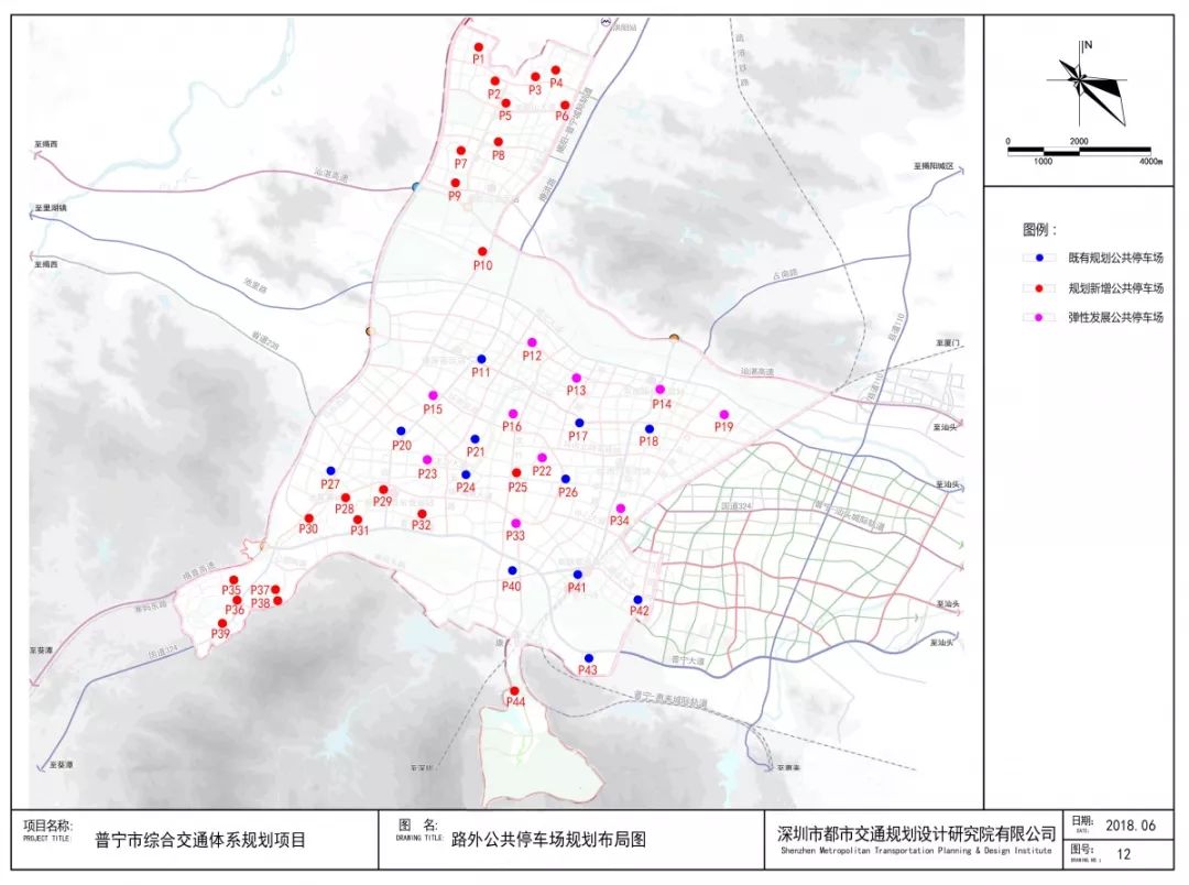 根据《普宁市综合交通体系规划(2016-2035)》提出:近期缓解重点地区的停车难问题,制订普宁停车配建标准,推行路内停车泊位设置;远期逐步建立合理的停车收费制度、健全车辆停放管理机制,引导小汽车合理使用,促进城市交通良性发展。根据城市发展重点和建设时序,在中心城区规划建设44座公共停车场,提供9919个机动车停车泊位,总占地面积约27.55万m2。规划设置路内停车泊位877个路内泊车位(非高峰准停泊位527个,夜间准停泊位350个)。