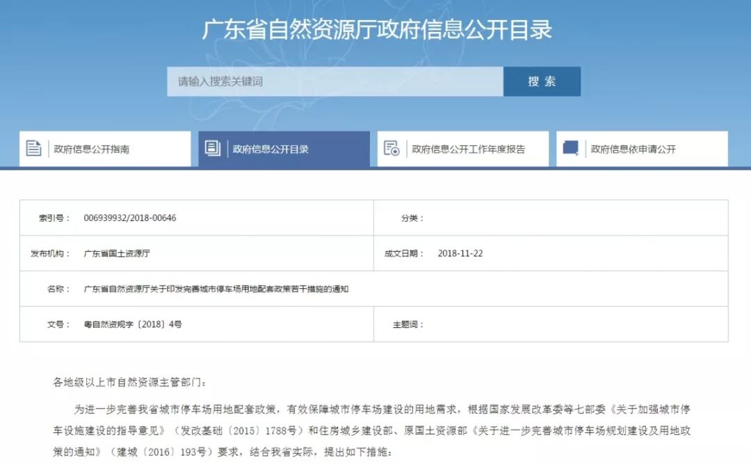 2018年底,广东省自然资源厅发布了《广东省自然资源厅关于印发完善城市停车场用地配套政策若干措施的通知》,旨在进一步完善广东城市停车场用地配套政策,有效保障城市停车场建设的用地需求的。