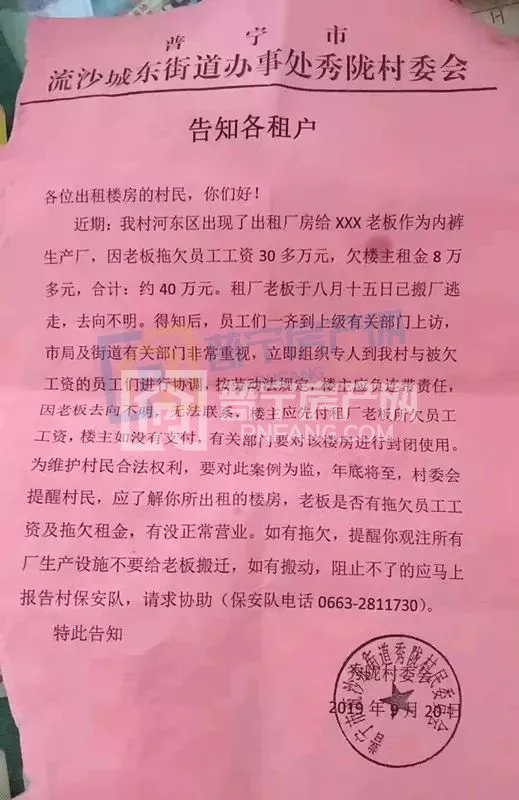 村委会提醒各位村民,应了解你所出租的楼房,老板是否有拖欠员工工资及拖欠租金,有没正常营业。如有拖欠,提醒各房东要注意厂内生产设施不要给老板搬迁,如有搬动,阻止不了的应马上报告村保安队。