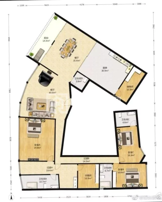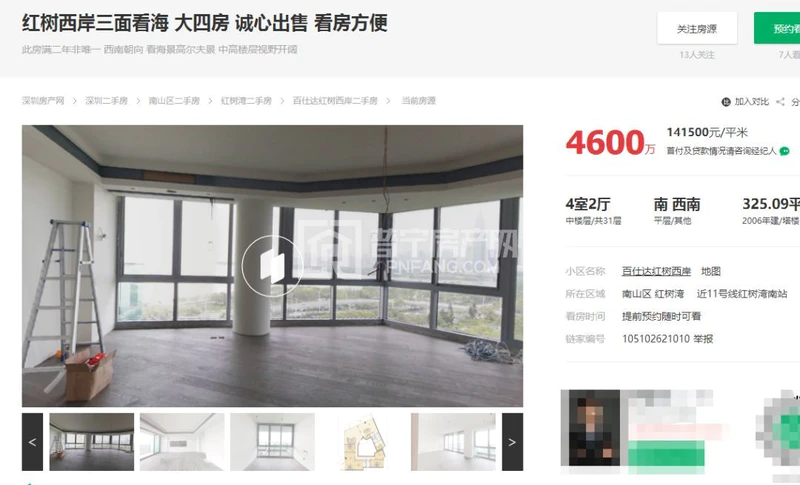 你以为这是段子手搞笑自己画的?查了查,竟然找到了此房真身!而且还在卖,该作品出自深圳红树西岸的海景房,323㎡钻石户型,报价4600万,单价约14万/㎡!
