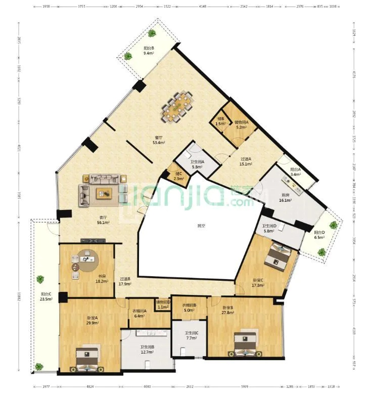 4. 日不落户型:五室两厅一厨三卫六阳台,东南西北全通透。霸气外露!可以每天在家转着圈儿晒太阳,不放过一分钟的阳光!