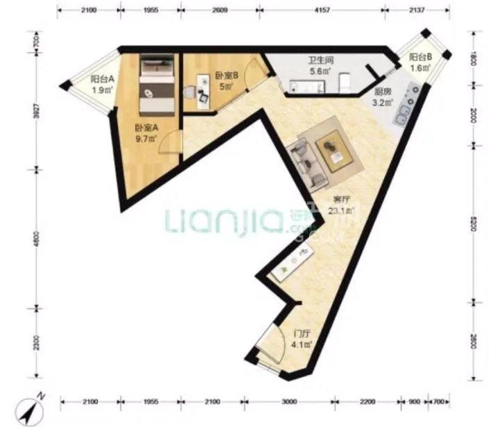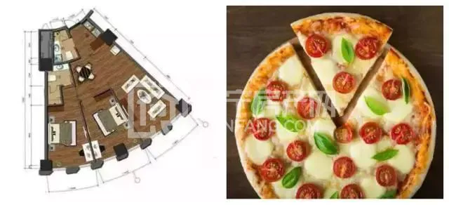 2. 恶魔之嘴户型:左下方向,像一个张开嘴的恶魔。两室一厅一厨一卫双阳台。西北方向和东北方向两个触角式阳台完成了房间的全部采光。