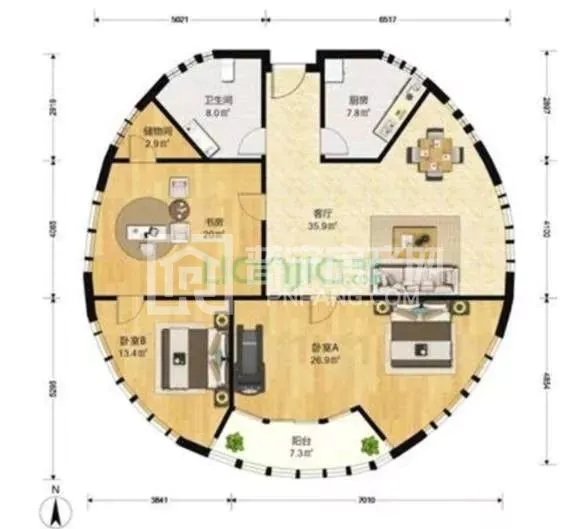 卧室宽敞,肚大能装,躺在桶身造型的卧室里,会有一种稳坐钓鱼台的感受。由于有南向阳台和厨房的北窗,从某种意义讲,这是一个南北通透的户型。