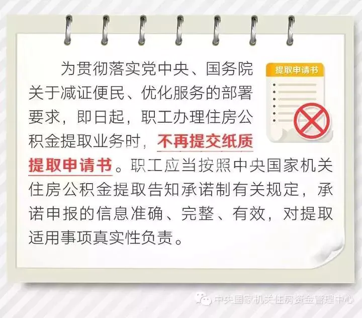 23日,中央国家机关住房资金管理中心网站发布《关于简化住房公积金提取业务申请材料的公告》称,即日起,职工办理住房公积金提取业务时,不再提交纸质提取申请书。