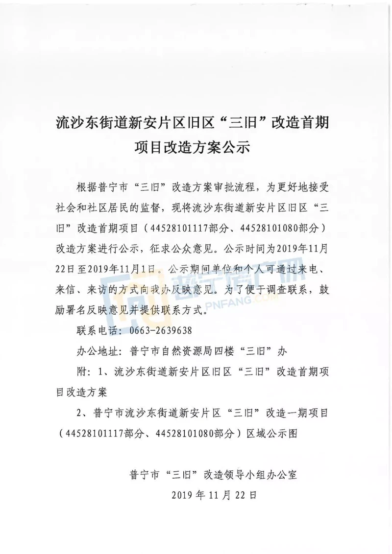 为实施“三旧”改造规划和年度实施计划,我市拟对位于流沙东街道新安片区旧区进行改造,首期改造旧区占地面积21050平方米(折31.57亩),四至为:东至安东街、西至新光南路、南至“豪门夜酒店”南侧道路、北至立新路的旧房进行改造。该地块已纳入普宁市“三旧”改造范围及2018年年度实施计划,现将《流沙东街道新安片区旧区“三旧”改造首期项目改造方案》予以公示。