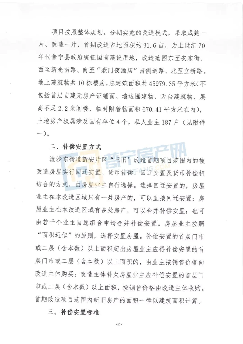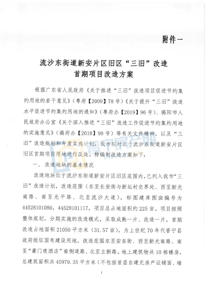 改造地块位于流沙东街道新安片区旧区范围内,已列入我市“三旧”改造计划,改造范围(东至长安街与新坛村交界处、西至新光南路、南至光平路、北至流沙大道),标图建库图斑编号为44528101080,44528101117,项目总占地面积约225亩。项目按照整体规划,分期实施的改造模式,采取成熟一片、改造一片,首期改造占地面积21050平方米(31.57亩),为上世纪70年代普宁县政府统征国有建设用地,改造范围东至安东街、西至新光南路、南至“豪门夜酒店”南侧道路、北至立新路。地上建筑物共10栋楼房,总建筑面积共45979.35平方米(不包括首层自建无房产证铺面、墙边围建物、天台建筑物、层高不足2.2米阁楼、临时附着物面积670.41平方米在内),土地房产权属涉及国有单位4个,私人业主187户。土地权属清晰,四至清楚,无争议。