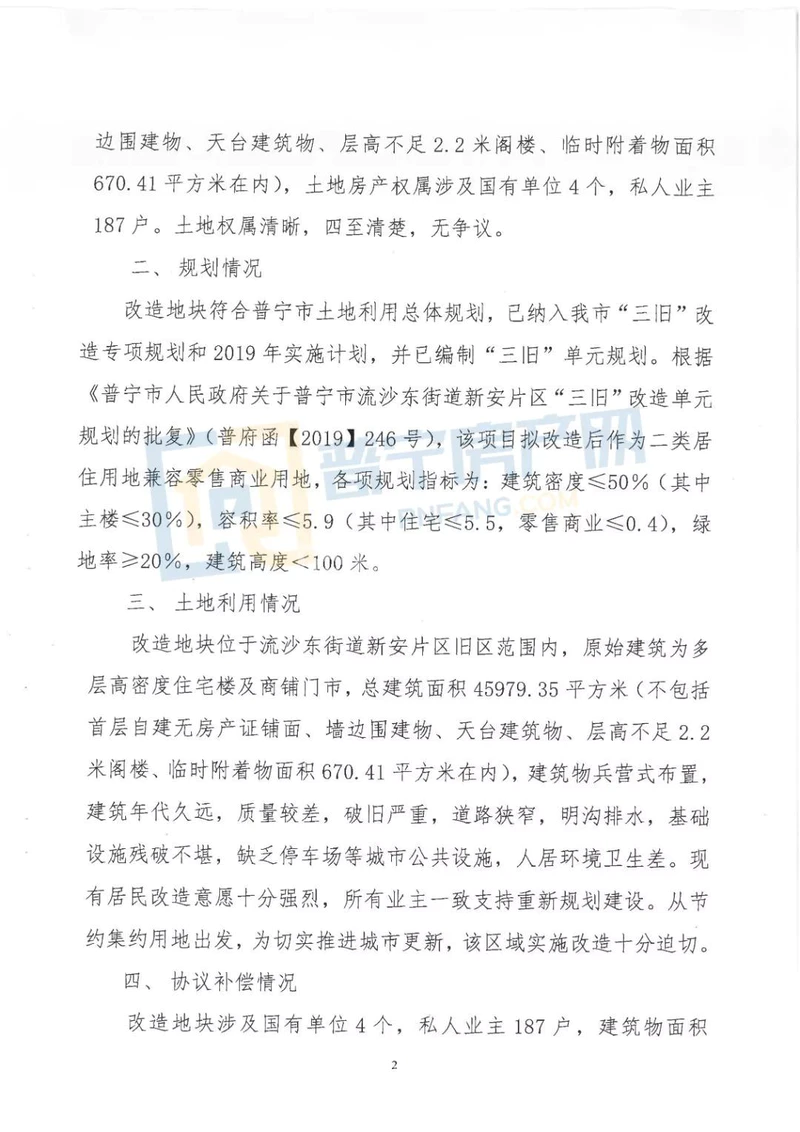 改造地块符合普宁市土地利用总体规划,已纳入我市“三旧”改造专项规划和2019年实施计划,并已编制“三旧”单元规划。根据《普宁市人民政府关于普宁市流沙东街道新安片区“三旧”改造单元规划的批复》(普府函【2019】246号),该项目拟改造后作为二类居住用地兼容零售商业用地,各项规划指标为:建筑密度≤50%(其中主楼≤30%),容积率≤5.9(其中住宅≤5.5,零售商业≤0.4),绿地率≥20%,建筑高度<100米。