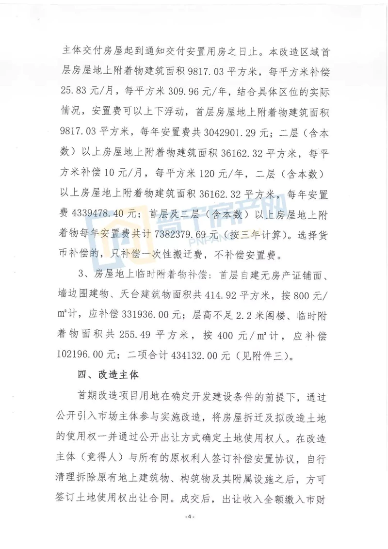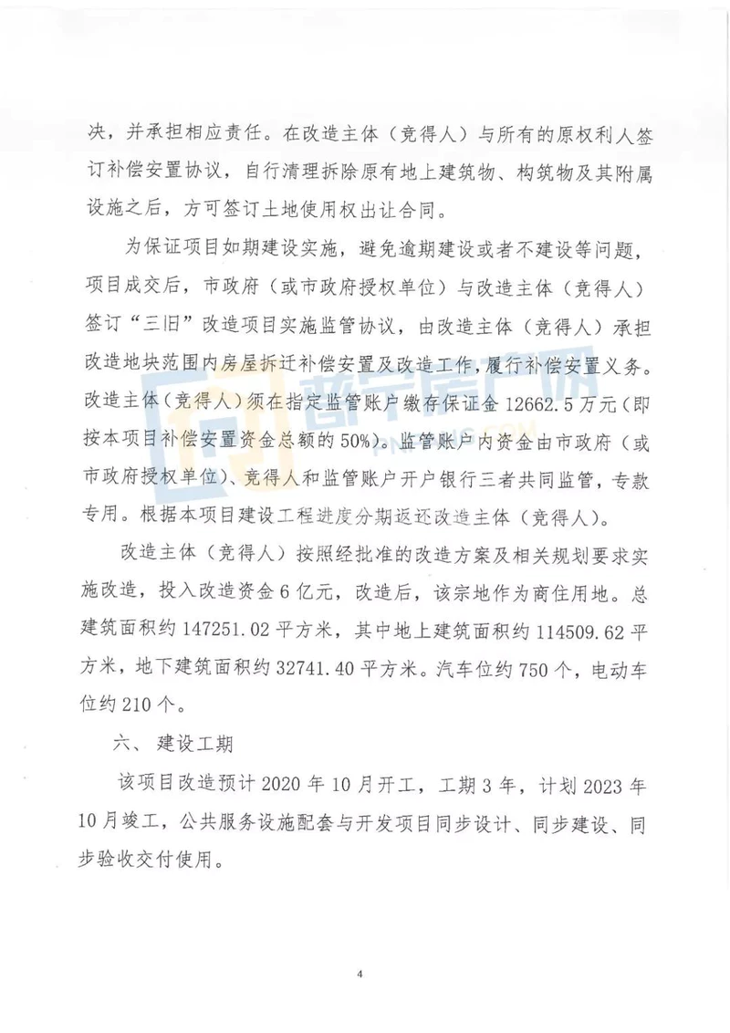 改造主体(竞得人)按照经批准的改造方案及相关规划要求实施改造,投入改造资金6亿元,改造后,该宗地作为商住用地。总建筑面积约147251.02平方米,其中地上建筑面积约114509.62平方米,地下建筑面积约32741.40平方米。汽车位约750个,电动车位约210个。
