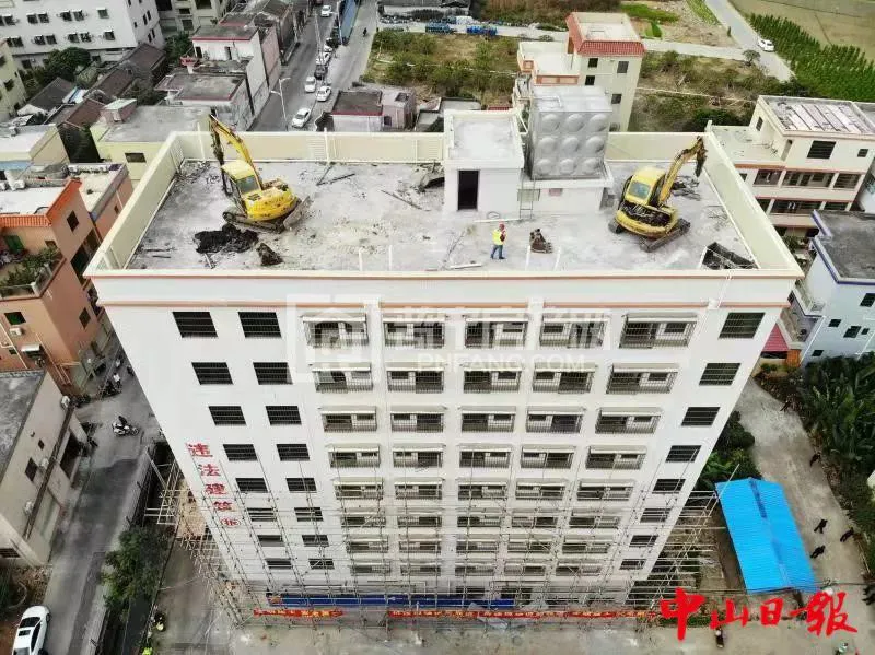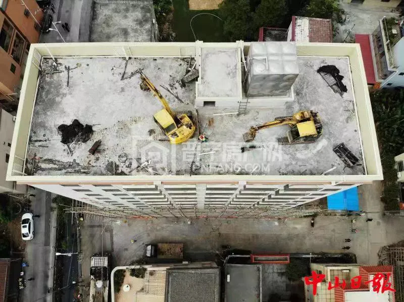 工作人员说,出于安全考虑,他们采用将挖掘机送上楼顶、自上而下的拆除方式。“由于违法建筑的规模较大,我们预计一个月左右才能完成拆除工作。”
