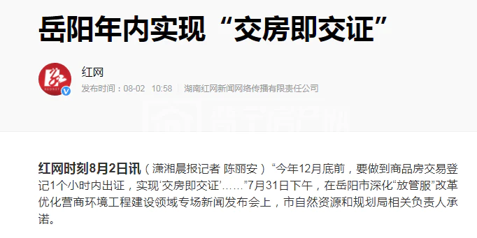 据都市快报报道,12月16日上午,在杭州上城区某楼盘买房的娄先生,和爱人一起从开发商手中接过钥匙,随即就在交房现场领取了《不动产权证书》大红本。幸福来得很意外! 据悉杭州市规划和自然资源局不动产登记中心依托“互联网+”,把登记窗口前移至楼盘交付现场,全省率先推出商品房“交房即交证”服务,打通服务“最后一公里”。购房者在收房拿钥匙后,无论按揭购房,还是全款付清,仅需结清税款、备齐资料,即可在收房时同步申请办理不动产登记,领取不动产权证书,无需再跑办事大厅。 据杭州市规划和自然资源局相关负责人介绍,尽管“交房即交证”,但用户无需担心安全问题,因为相关手续和资料的准备、不动产登记审核并没有“省略”,而是被前置了。 今后,只要符合条件的开发商向该局不动产登记中心提出申请,业主均可体验“交房即交证”的优质服务。而且,目前该局参与开发的智能远程制证设备已经成熟,娄先生夫妇的这本证就是由这台设备制作的,只要现场安保措施到位,现场制证完全没有问题。 除了杭州,还有两个省会城市也已经将“交房即交证”落到实处。 今年11月18日,湖南长沙市的中建·嘉和城成为了长沙市城区“交房即交证”首个正式落地实施的项目。当日,共有30户业主代表同时拿到了钥匙和不动产权证书。 据长沙市住建局负责人介绍,长沙市政府于3月28日印发了《长沙市推进新建商品房交房交证改革试点工作方案》,正式启动改革试点工作。截至11月18日,全市12个申请试点的项目中共有3个项目实现了交房交证的目标。接下来,将进一步做好经验总结,将改革试点成果于明年全面推广。 在以前,如果买了长沙的期房,交房一般需要一年半,交房后要一年半到两年才能办出房产证,办出证4年后才能出售。这就意味着4年限售实际变成了7年限售甚至8年限售。 查询媒体报道可以发现,除了长沙,湖南郴州、株洲、岳阳也已启动“交房即交证”试点。 就在上述杭州业主获得“交房即交证”服务的同一天,云南昆明也有业主获得了同样服务。 图片来源:昆明日报 据昆明日报消息,12月16日下午,昆明市自然资源和规划局在云南万科翡翠二期项目售楼部举行昆明市新建商品房“交房即交证”启动暨颁证仪式。云南万科翡翠二期项目的38户业主代表,在拿到新房钥匙的同时,还拿到了不动产权证书。宣告昆明进入“交房即交证”时代。