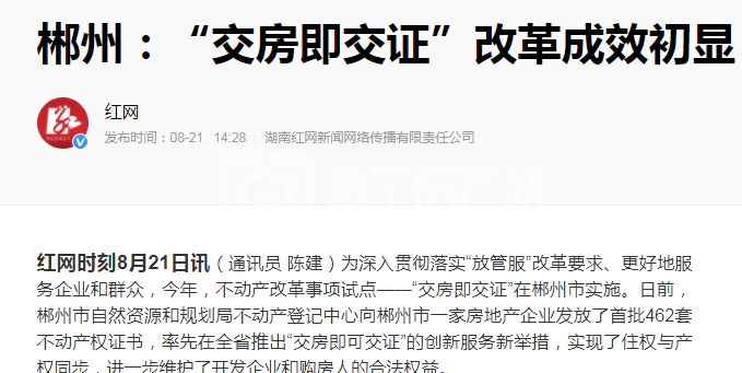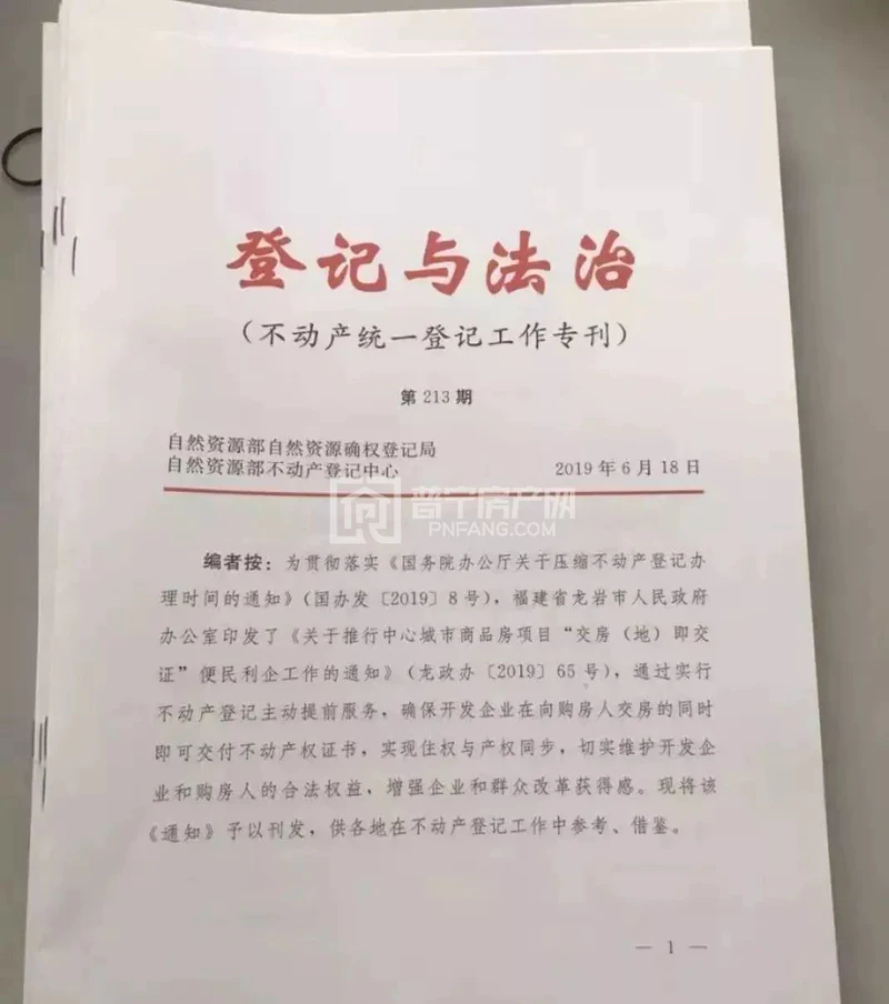 不动产权证是房产归属的证明。在实施“交房即交证”政策之前,购房者在开发商交房之后,需要经历较长时间等待,才能拿到不动产权证书。交房与交证的不同步,给购房者在落户、子女入学、银行贷款等方面造成了一定困扰。最重要的是,没有不动产权证,房子就不能卖。 今年3月,国务院办公厅印发《关于压缩不动产登记办理时间的通知》,通知提出,2019年底前,流程精简优化到位,全国所有市县一般登记、抵押登记业务办理时间力争分别压缩至10个、5个工作日以内;2020年底前,力争全部压缩至5个工作日以内。 小编查询媒体报道发现,福建龙岩市是最早将“交房即交证”服务落到实处的城市。 今年5月,龙岩市政府决定在龙岩中心城区推行新建商品房项目“交房即交证”不动产登记工作。 龙岩市不动产登记中心负责人李国钊介绍,“交房即交证”要求开发企业严格落实在新建商品房不动产登记办证中的主体责任,破解了项目审批后监管难的问题。 李国钊说,群众在收房拿钥匙的同时,马上可领取不动产权证书,有利于解决小孩落户、积分入学等民生问题,大大保障了购房人的合法权益。 据中共龙岩市委机关报“闽西日报”报道,龙岩一家名为“印象天澜”的楼盘,今年7月1日向市不动产登记中心提出“交房即交证”办件申请,至7月12日,该楼盘的1600本不动产权证书(963套住宅、637个车位)即全部办妥。7月18日,首批200多名购房人前来办理交房手续,同时领到了不动产权证书。 “闽西日报”7月的报道显示,当时龙岩中心城区又有4个新建商品房项目共4883套住宅(不含车位)正在向市不动产登记中心申请办理“交房即交证”业务。 图片来源:闽西日报 龙岩“交房即交证”的办证改革举措,为福建省率先、全国领先。今年6月自然资源部在全国推广龙岩的这一创新做法。