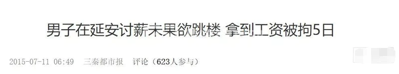 2015年7月9日,陕西延安一名男子因索要工资未果,在黄蒿湾嘉丰国际28号楼顶欲跳楼自杀。后经警方协调,尹某与承建方如数结算了劳动报酬——而后,派出所依法对尹某行政拘留五日。