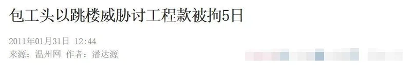 2011年1月29日,浙江温州包工头李某爬上厂房顶楼以跳楼相威胁讨薪,最终违反《治安管理法》被公安机关处以5日行政拘留。而在当月,温州鹿城区共发生4起建筑工程包工头跳楼讨工资事件。