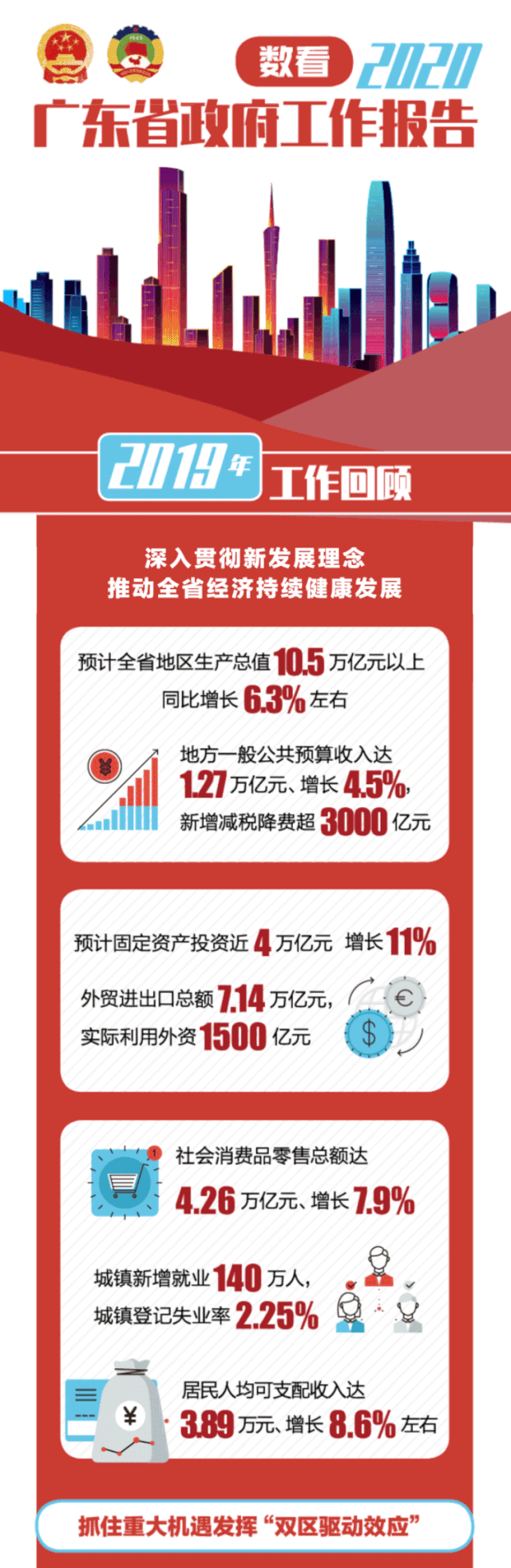 1月14日上午,广东省十三届人大三次会议开幕,广东省省长马兴瑞作政府工作报告。 马兴瑞表示,广东将加快推进新型城镇化,放开放宽除广州、深圳以外的城市落户限制,做强做优县域经济,不断提升中心城区、县城和中心镇承载能力。 我国户籍制度改革正在加快推进。日前,中共中央办公厅、国务院办公厅联合印发《关于促进劳动力和人才社会性流动体制机制改革的意见》,明确要以户籍制度和公共服务牵引区域流动。全面取消城区常住人口300万以下的城市落户限制,全面放宽城区常住人口300万至500万的大城市落户条件。完善城区常住人口500万以上的超大特大城市积分落户政策,精简积分项目,确保社会保险缴纳年限和居住年限分数占主要比例。 与此同时,广东也一直在加快这一领域的改革探索,日前国家明确11个地区为国家城乡融合发展试验区,广东推进多年的广清接合片区也位列其中,获得国家层面肯定和重视。 马兴瑞是在提及“健全城乡融合发展体制机制”时作出以上表述,他还进一步表示,广东将积极开展破解城乡二元结构试点示范,推进国家城乡融合发展试验区广清接合片区建设。加快城乡基础设施互联互通、公共服务普惠共享。深入推进乡村人才振兴和“万企帮万村”“三师下乡”等行动,建立城市人才入乡激励机制和工商资本入乡促进机制,实施“乡村工匠”等工程,吸引各类人才到农村创业发展等。 第十三届人民代表大会 第三次会议上政府工作报告 除了提到城市落户等重点 还有哪些值得关注?