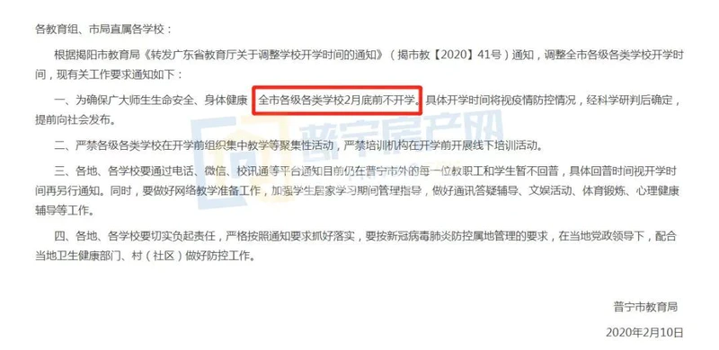 今天,广东省教育厅对外公布,为坚决防止疫情输入校园,保证师生生命安全、身体健康,维护校园安全稳定,广东省教育厅防控新型冠状病毒肺炎疫情工作领导小组印发了《关于强化疫情防控措施加强校园安全管理的通知》,对各地级以上市教育局,各大专院校,省属中职学校、省属中小学校,省外高校在粤办学机构提出七点具体要求。 强化疫情防控措施加强校园安全管理要做到这七点 1 校园实行封闭式管理。各地各学校要强化阵地意识,用最严格的措施把好校园入口关,守住校门第一关,严防疫情输入校园。要坚决做到“五个一律”:未经学校批准,学生一律不准提前返校;校外无关人员一律不准进入校园;师生进入校园一律核验身份并检测体温;对发烧咳嗽者一律实行医学隔离观察;不服从管理者一律严肃处理。严格管控进入校园人员和车辆,做到逢人必检、逢车必查,严格检查车上人员、随车物品、车辆后尾箱。 2 校内实行网格化管理。各学校要实行划区划片网格化管理,教学楼、学生公寓、饭堂等人员密集场所要实行封闭式管理,限制人流量,进出人员必须实名登记并检测体温。要科学划定疫情防控网格,明确网格责任人和职责,将疫情防控任务分解落实到每个网格、每位网格员。学校领导要挂点具体网格,深入一线,靠前指挥,狠抓防控措施落实。 3 未返校师生实行“人盯人”管理。各学校要全面摸清、准确掌握未返校师生信息及健康状况,院(系)负责人、辅导员、班主任采取“人盯人”措施,全面掌握师生动态,特别是湖北等疫情防控重点地区师生情况,主动联系每一位师生,通报学校疫情防控措施,除特殊原因并报学校批准外,不得提前返校。 4 加强安保、保洁、食堂、宿舍管理、物业管理、商场超市等与校外交集较多的后勤人员管理。各学校要全面摸清校园安保、保洁、食堂、宿舍管理、物业管理、商场超市等与校外交集较多的后勤人员数量、籍贯、身体状况、兼职状况等,加强教育培训,明确工作制度、纪律要求,合理安排工作时间,保障口罩等必要的防疫物品,加强对此类人员进出校园的晨检和随机检查,发热、感冒、咳嗽、呼吸道感染人员要立即隔离,及时到医疗机构就诊。 5 强化校园巡查管控。各学校要加强校园巡查管控,发现学生提前返校、校园人员外出未戴口罩或聚集活动,要及时劝阻制止。不听劝阻者,依据有关法律法规和校纪校规严肃处理。需要隔离、治疗人员不配合隔离、治疗的,或隔离期未满擅自脱离隔离的,及时联系属地卫生和公安机关依照《中华人民共和国传染病防治法》《突发公共卫生事件应急条例》等法律法规依法处理。 6 及时处理废弃口罩、餐盒等有害垃圾。加强校园爱国卫生工作,集中收集并及时处理废弃口罩、餐盒等有害垃圾,灭鼠灭蝇,清理污水,营造良好校园卫生环境,严防发生校园聚集性疫情。 7 充分发挥联防联控、群防群治作用。建立疫情投诉举报快速反应机制,充分发挥师生监督作用,对师生投诉快速反应,快速处置,坚决防止疫情在校园传染扩散。 为阻断疫情向校园蔓延,今日普宁市教育局发布《关于调整学校开学时间的通知》,明确全市各级各类学校2月底前不开学。 望相关人员能够按要求落实到位,做好校园疫情防控,切实保障广大师生的身体健康和生命安全。
