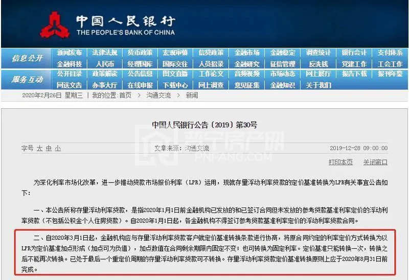 按照央行公告,自2020年3月1日起,金融机构应与存量浮动利率贷款客户就定价基准转换条款进行协商,将原合同约定的利率定价方式转换为以LPR为定价基准加点形成(加点可为负值),加点数值在合同剩余期限内固定不变;也可转换为固定利率。定价基准只能转换一次,转换之后不能再次转换。