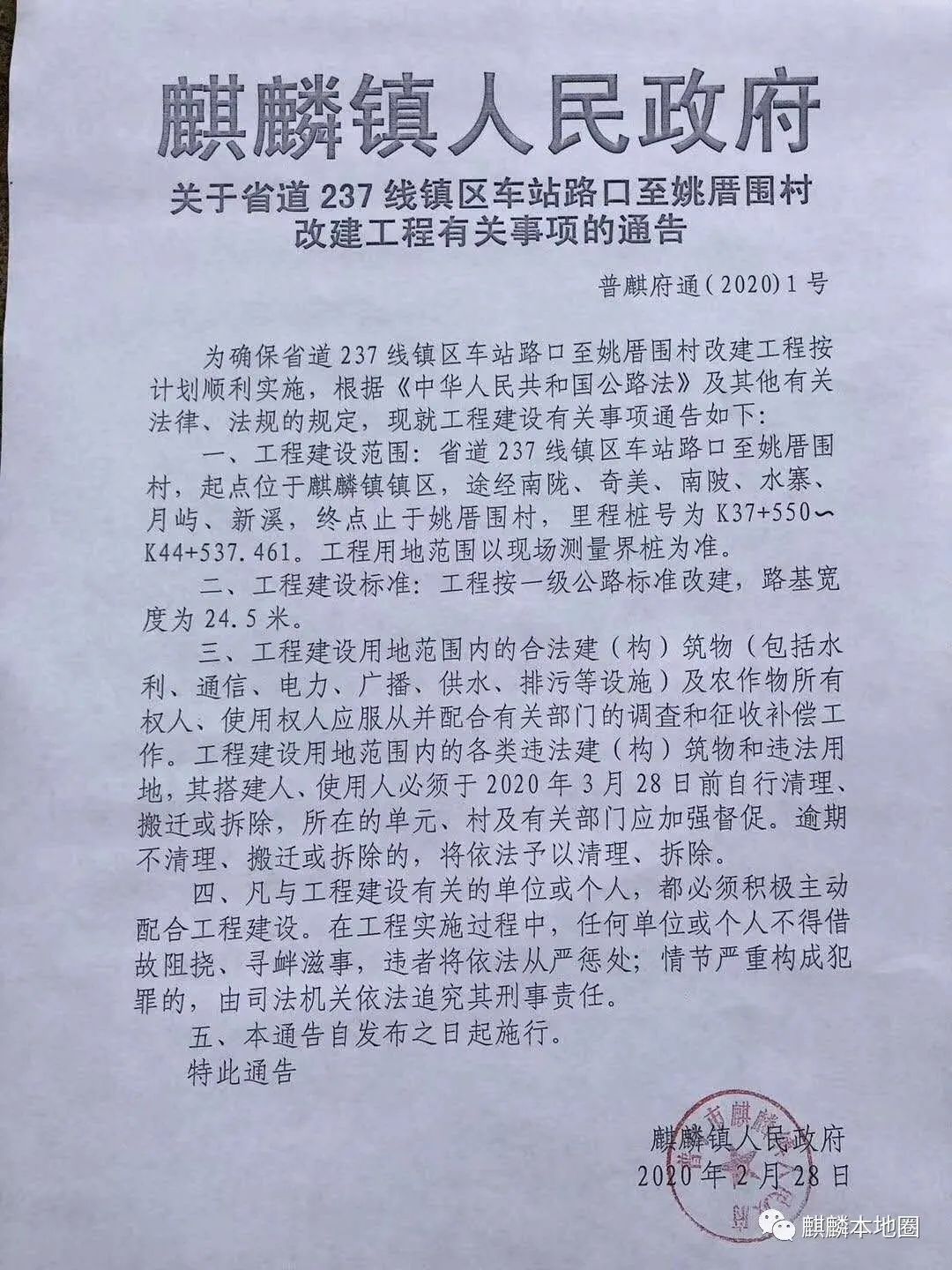 近日,小房君了解到麒麟镇人民政府发布了《关于省道237线镇区车站路口至姚厝围村改建工程有关事项的通告》,据通告介绍,该工程将按一级公路标准改建,起点位于麒麟镇镇区,终点止于姚厝围村。通告如下: