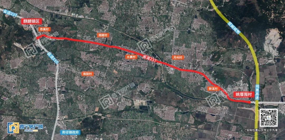 ▲路段卫星图 据悉,麒麟镇区至姚厝围段工程将按一级公路标准改建,路基宽度为24.5米。设计速度80公里/小时(城镇路段60公里/小时),原计划双向六车道的路将改建成双四车道。 省道237线是我省重要的干线公路,也是我市连接揭西县、汕头市和揭惠高速公路的重要通道。其中,一期麒麟镇区至姚厝围段先行建设,二期为赤岗至麒麟段。该道路由于使用年限已久,路面出现破损、沉降等现象,道路行车安全性能差,严重影响交通安全,市民一直期盼可以进行修整改建。如今随着揭惠高速公路的建成,省道237的改建工程同样迫在眉睫。 期待早日开工 为市民出行提供安全 舒适的交通环境!