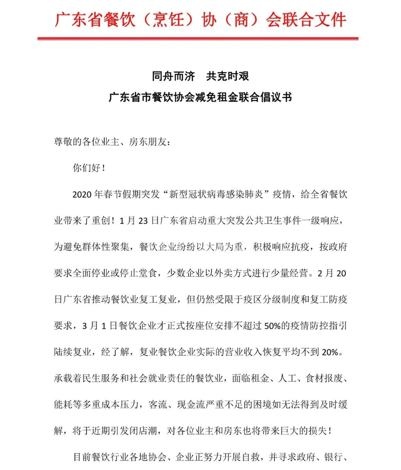 对于美食之地的广东,突如其来的新冠肺炎疫情“黑天鹅”,餐饮行业成为受到影响最直接、最严重的行业之一。面对这样的困境,广东省市餐饮协会发布联合文件,减免租金联合倡议书,具体倡议如下: