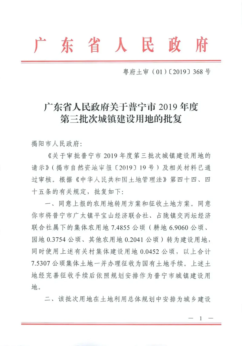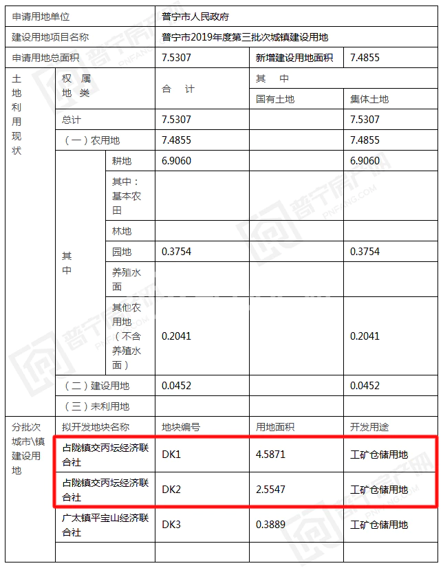 据市人民政府相关文件显示,普宁市2019年度第三批次城镇建设用地包括了占陇镇交丙坛村和广太镇平宝山村的地块,合计面积为7.5307公顷(折合约112.96亩),其中将征收占陇镇交丙坛7.1418公顷(折合107.13亩)的土地,将作为工矿仓储用地。
