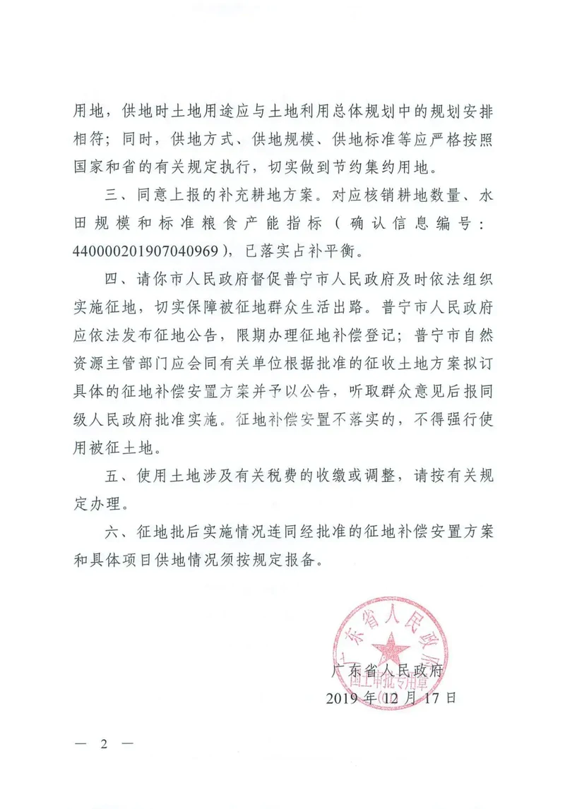 经省人民政府批准(批准文号:粤府土审(01)〔2019〕368号,批准时间:2019年12月17日),同意普宁市人民政府征收占陇镇交丙坛经济联合社属下的集体土地7.1418公顷(折合107.13亩)。根据《中华人民共和国土地管理法》第46条、《中华人民共和国土地管理法实施条例》第25条和《广东省实施〈中华人民共和国土地管理法〉办法》的有关规定,现将有关事项公告如下:
