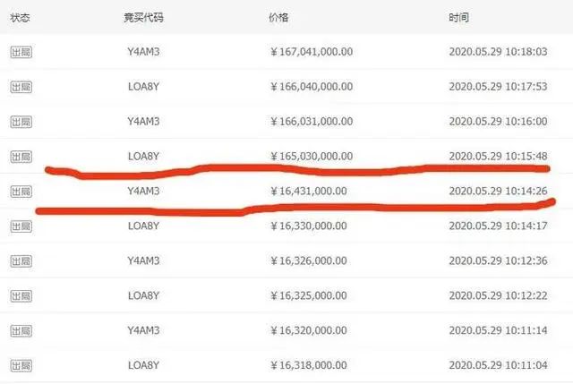 竞拍标的物是北京市朝阳区新锦路18号院285号一套305.67平米的住宅,其评估价为1418.31万元。 5月28日上午10点,该房产在某平台以1277万元开拍,加价幅度0.1万元,参拍保证金为192万元。 拍卖开始后,该套房产一直以0.1万元的加价幅度缓慢上涨。 5月29日上午10点之后,竞价趋于白热化。 此时,谁都没料到,一个惊天大乌龙悄然发生。 10:14:26,编号Y4AM3竞拍者在出价1643.1万元,1秒钟之后,10:15:48,编号为LOA8Y的竞买人直接将16,431,000.00跳价至165,030,000元。 也就是说该房产出价直接从1643万跳至1.65亿。