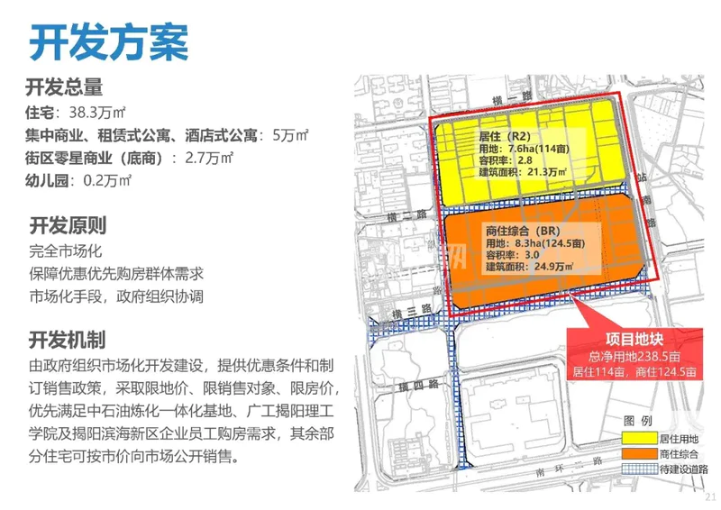 根据揭阳滨海新区“一城两园”总体规划,为有效保障中委广东石化炼化基地、广工揭阳理工学院和揭阳滨海新区产业工作人员居住和商业服务需求,提升粤东新城生活服务品质,促进产城互动,拟开发建设粤东新城城市社区人才安居项目。该项目规划总用地面积386.21亩,分两期进行开发建设,第一期用地面积249.13亩,第二期用地面积137.08亩。