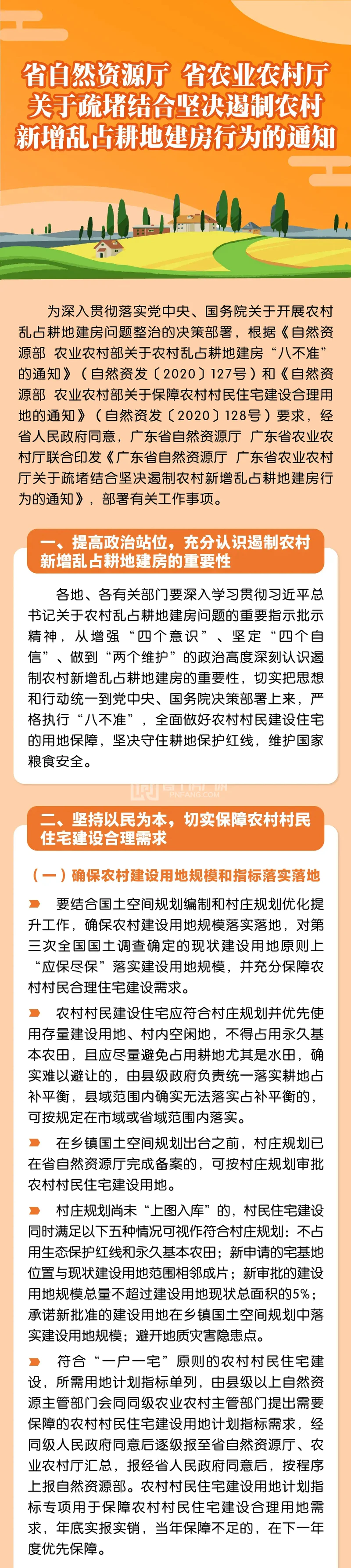 近日,广东省自然资源厅联合省农业农村厅印发《关于疏堵结合坚决遏制农村新增乱占耕地建房行为的通知》,从“疏”和“堵”两方面明确了农村乱占耕地建房问题的解决思路和方法,明确各级人民政府是本行政区域土地管理的主要责任主体,同时强调要切实保障农民合理的住房需求,一定要解决农民因合理需求得不到满足而占用耕地违法建房的问题。《通知》自11月4日起实施,有效期3年。