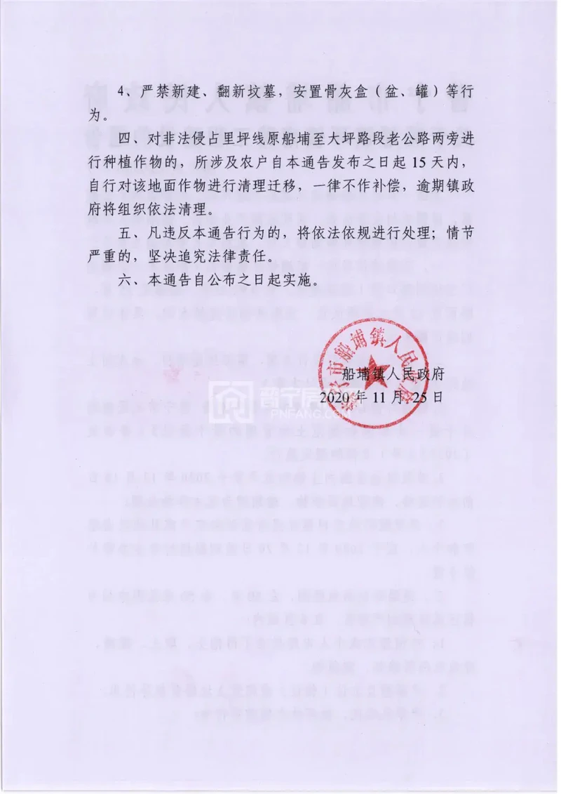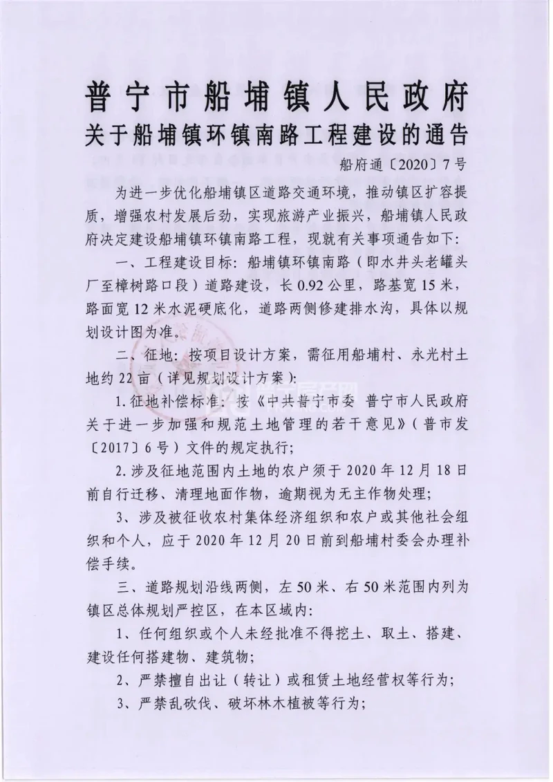 为进一步优化船埔镇区道路交通环境,推动镇区扩容提质,增强农村发展后劲,实现旅游产业振兴,船埔镇人民政府决定建设船埔镇环镇南路工程,现就有关事项通告如下:一、工程建设目标:船埔镇环镇南路(即水井头老罐头厂至樟树路口段)道路建设,长0.92公里,路基宽15米,路面宽12米水泥硬底化,道路两侧修建排水沟,具体以规划设计图为准。二、征地:按项目设计方案,需征用船埔村、永光村土地约22亩(详见规划设计方案):1.征地补偿标准:按《中共普宁市委 普宁市人民政府关于进一步加强和规范土地管理的若干意见》(普市发〔2017〕6号)文件的规定执行;2.涉及征地范围内土地的农户须于2020年12月18日前自行迁移、清理地面作物,逾期视为无主作物处理;3.涉及被征收农村集体经济组织和农户或其他社会组织和个人,应于2020年12月20日前到船埔村委会办理补偿手续。三、道路规划沿线两侧,左50米、右50米范围内列为镇区总体规划严控区,在本区域内:1.任何组织或个人未经批准不得挖土、取土、搭建、建设任何搭建物、建筑物;4.严禁新建、翻新坟墓,安置骨灰盒(盆、罐)等行为。四、对非法侵占里坪线原船埔至大坪路段老公路两旁进行种植作物的,所涉及农户自本通告发布之日起15天内,自行对该地面作物进行清理迁移,一律不作补偿,逾期镇政府将组织依法清理。五、凡违反本通告行为的,将依法依规进行处理;情节严重的,坚决追究法律责任。
