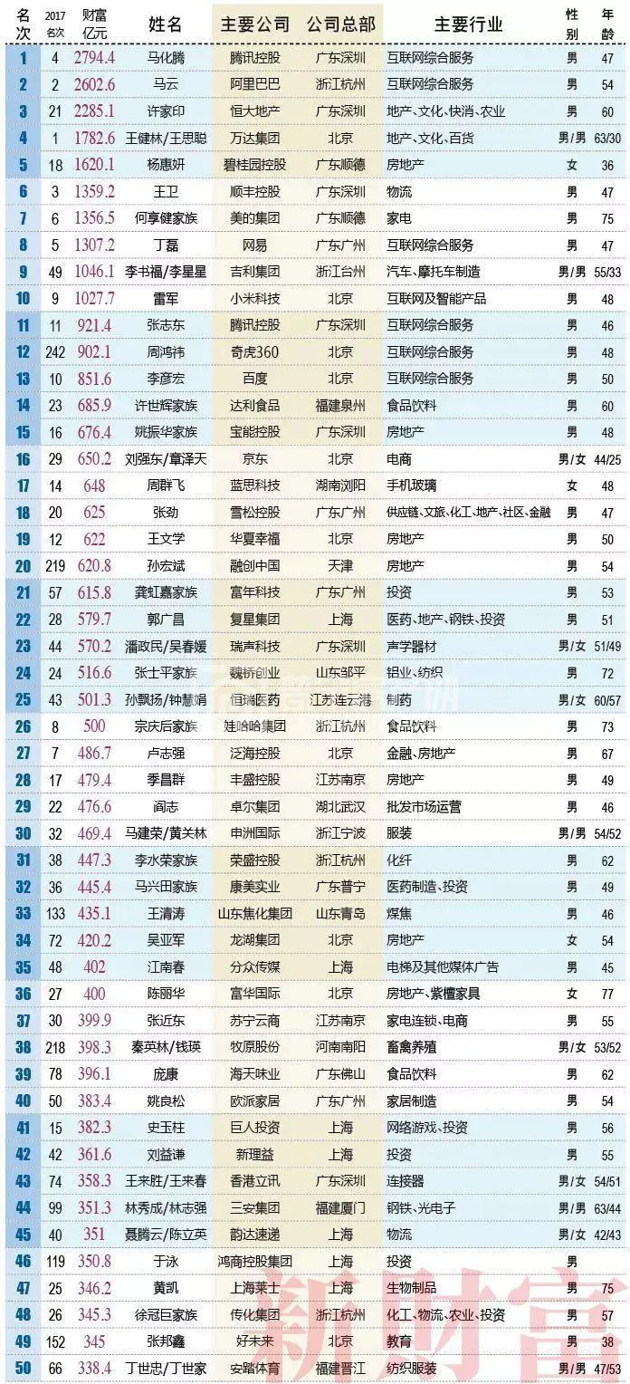 2018新财富500富人榜出炉!“首富”易主,马云仅排第二
