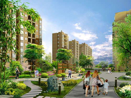 围合式小区便于布置活动场地和绿地、公建,环境相对也比较安静,围合式布置有利于小区的安全管理。围合式楼盘采取同心圆式的建筑布局,将景观放在楼盘中央,这能够保证“户户朝景”。