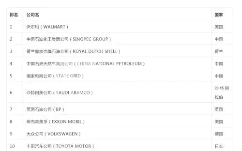 榜单前十。《财富》世界500强排行榜。