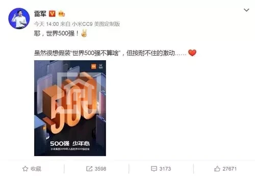 小米上榜,雷军发朋友圈。微博截图